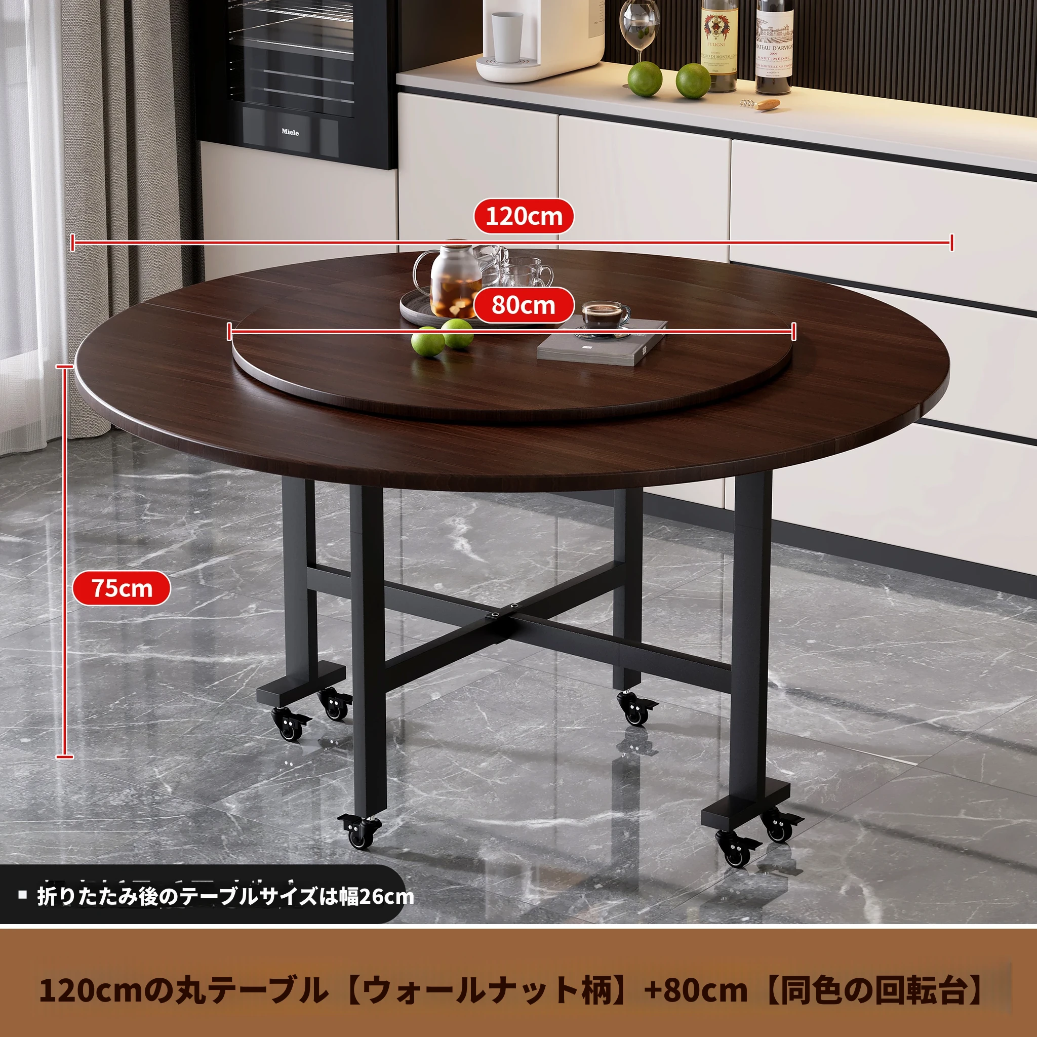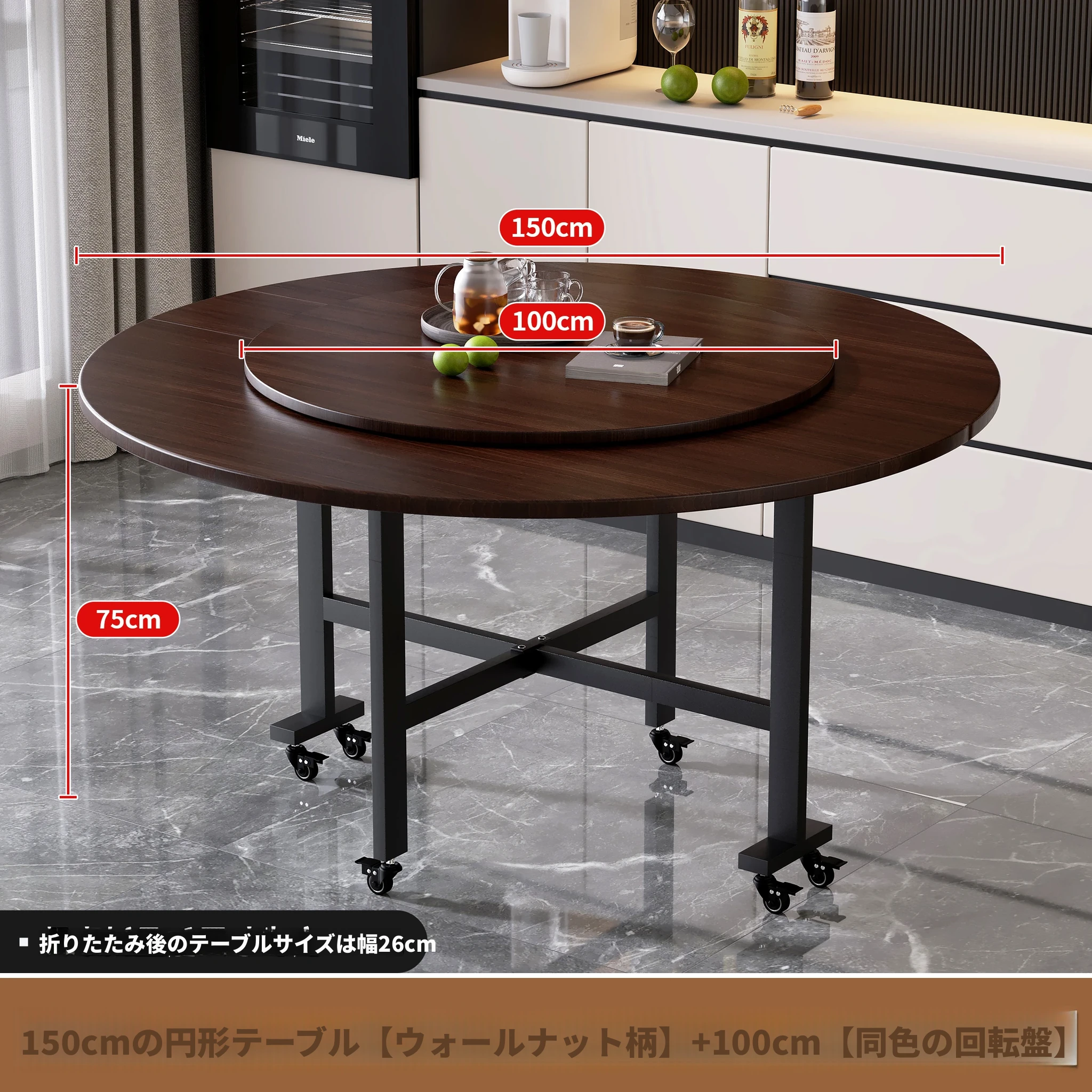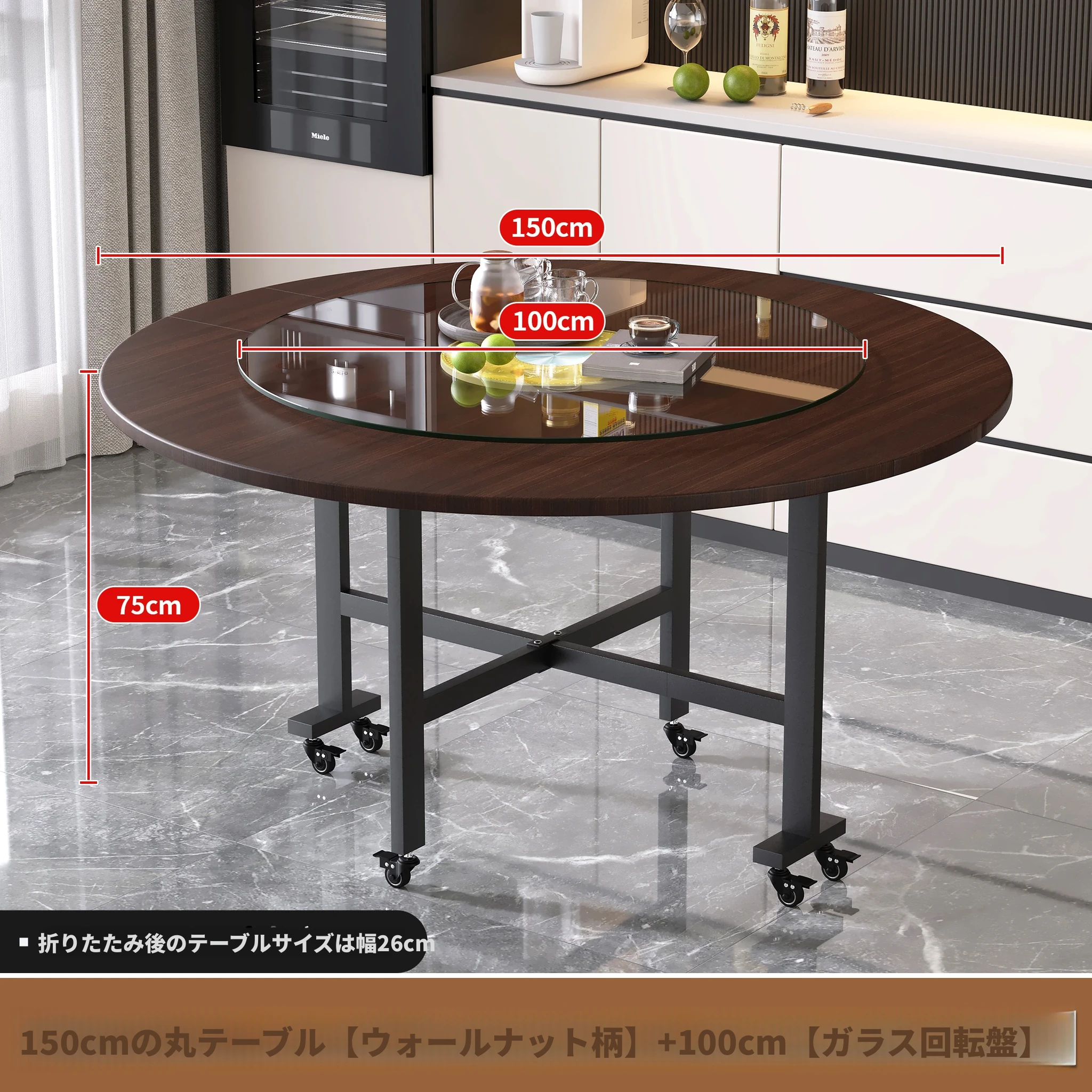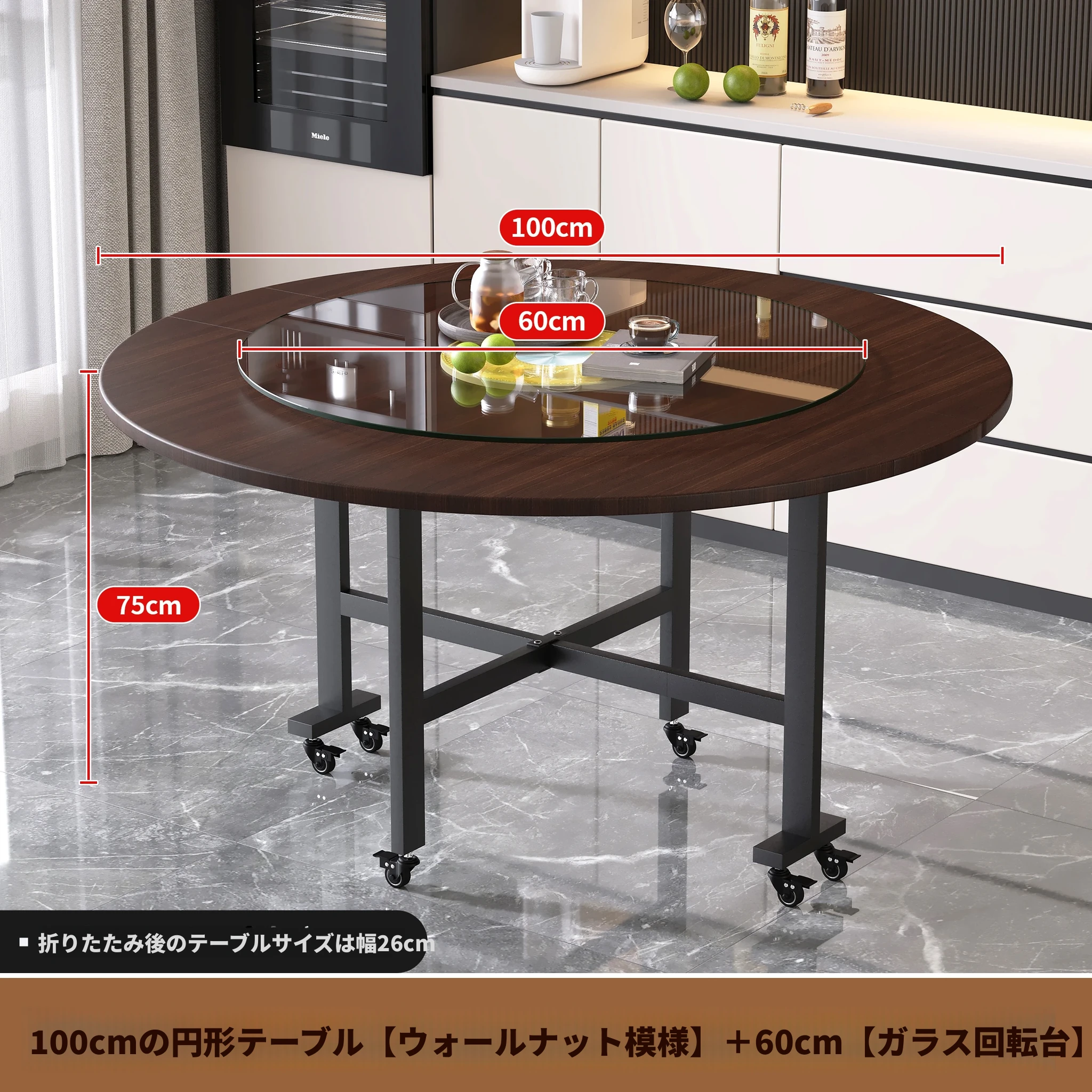 1.0メートルブラックウォールナット模様+0.6ガラスターンテーブル