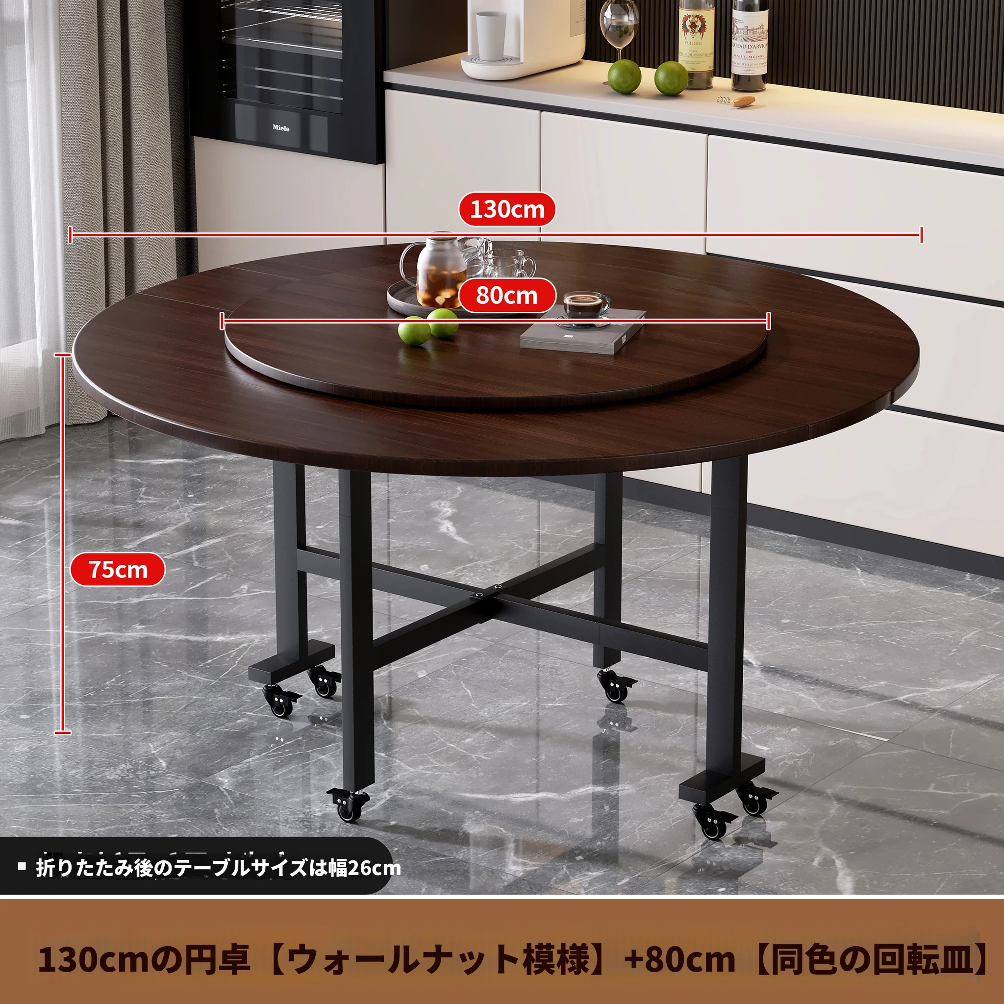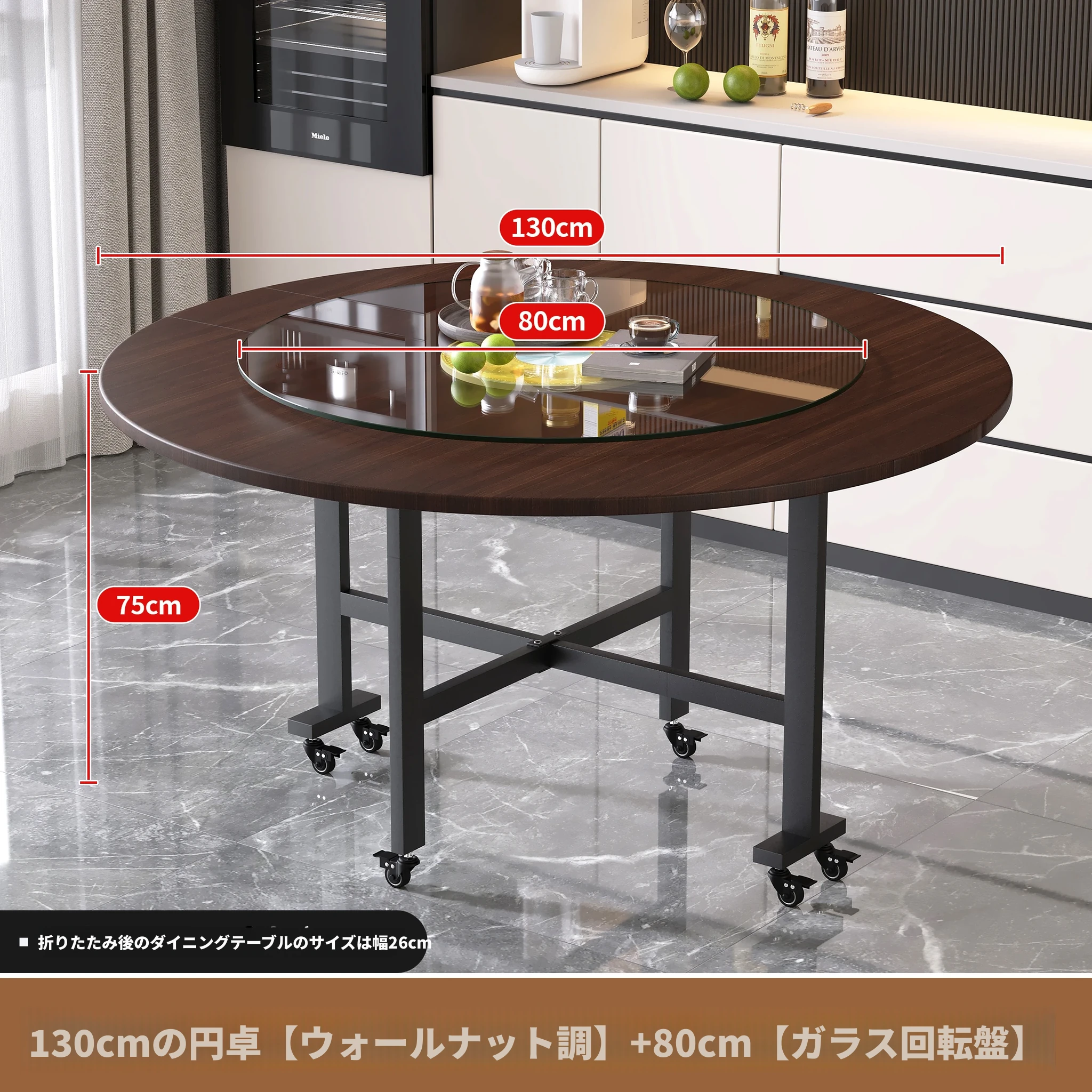 1.3メートルブラックウォールナット模様+0.8ガラスターンテーブル