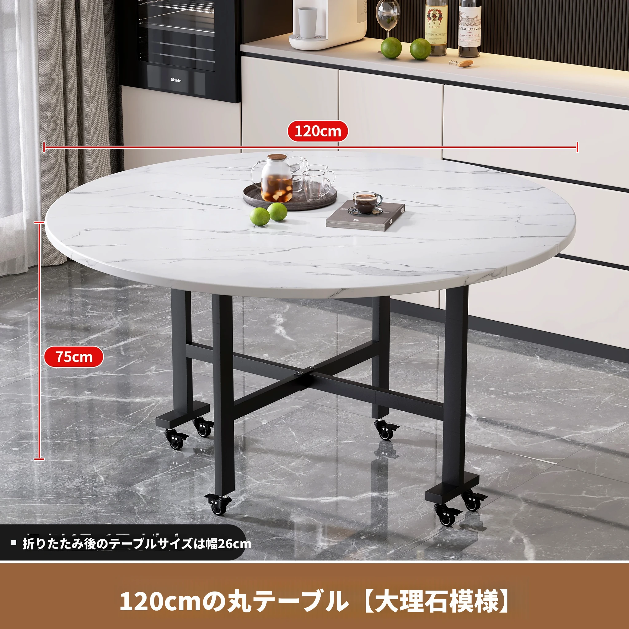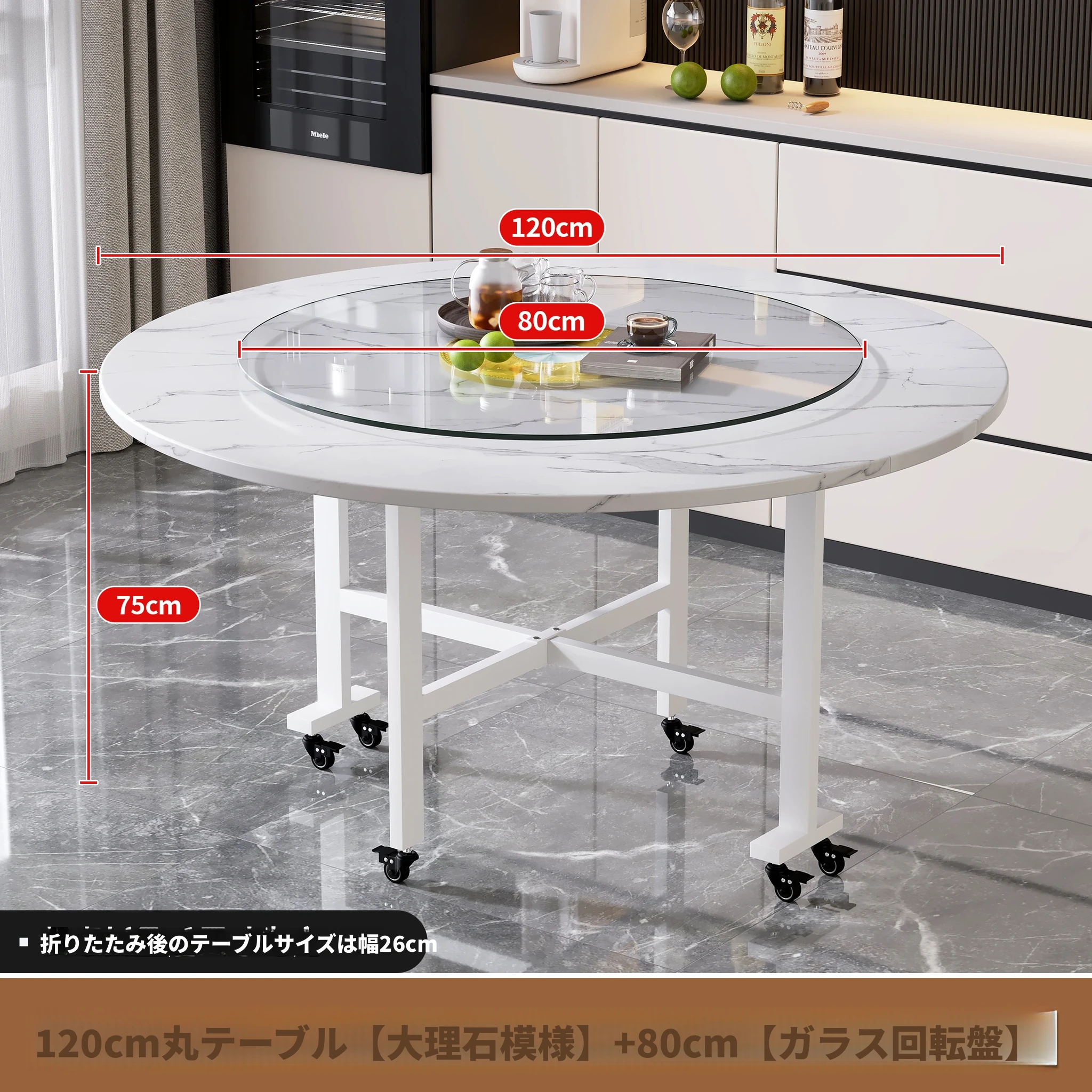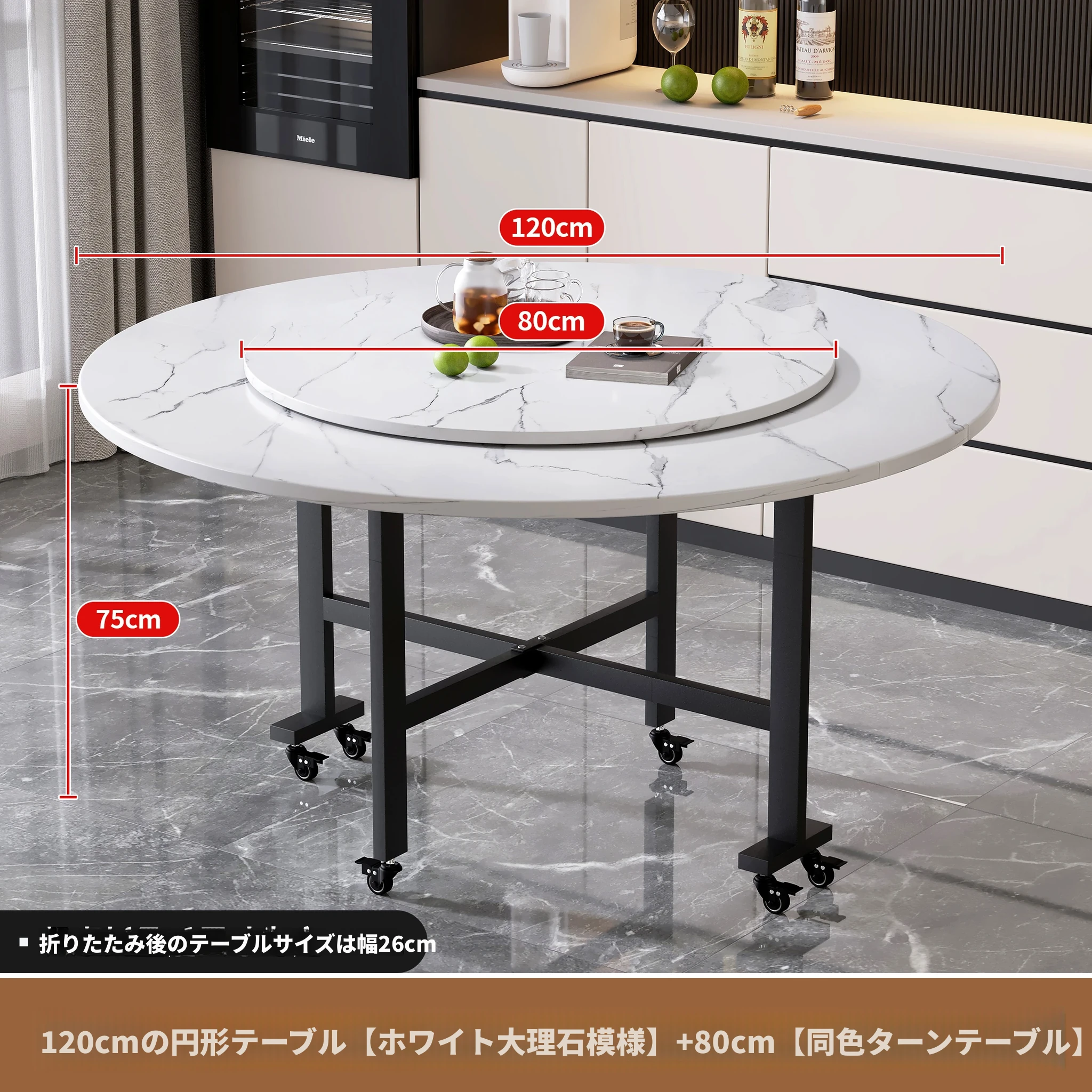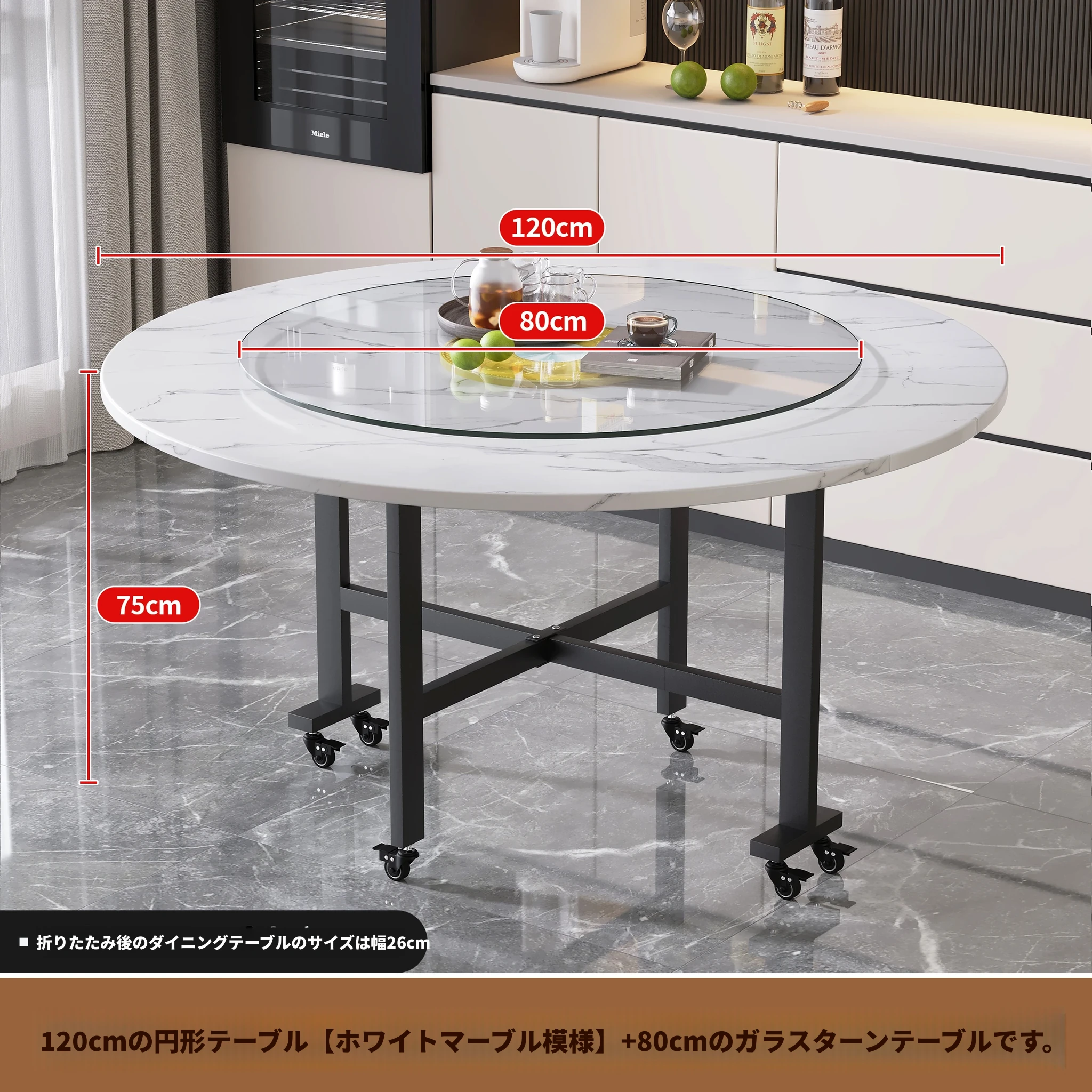 1.2メートル白大理石白脚★キャスター付き+同色0.8ターンテーブル