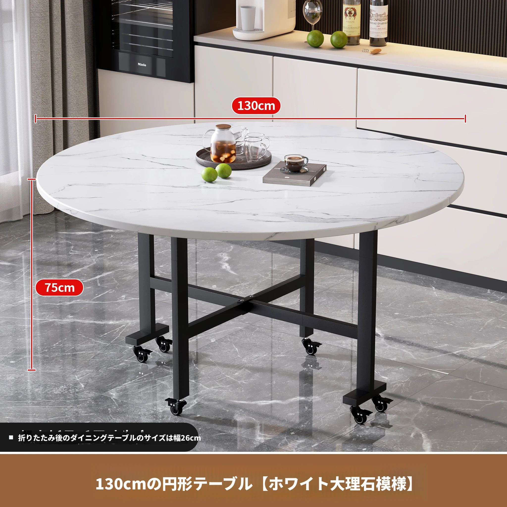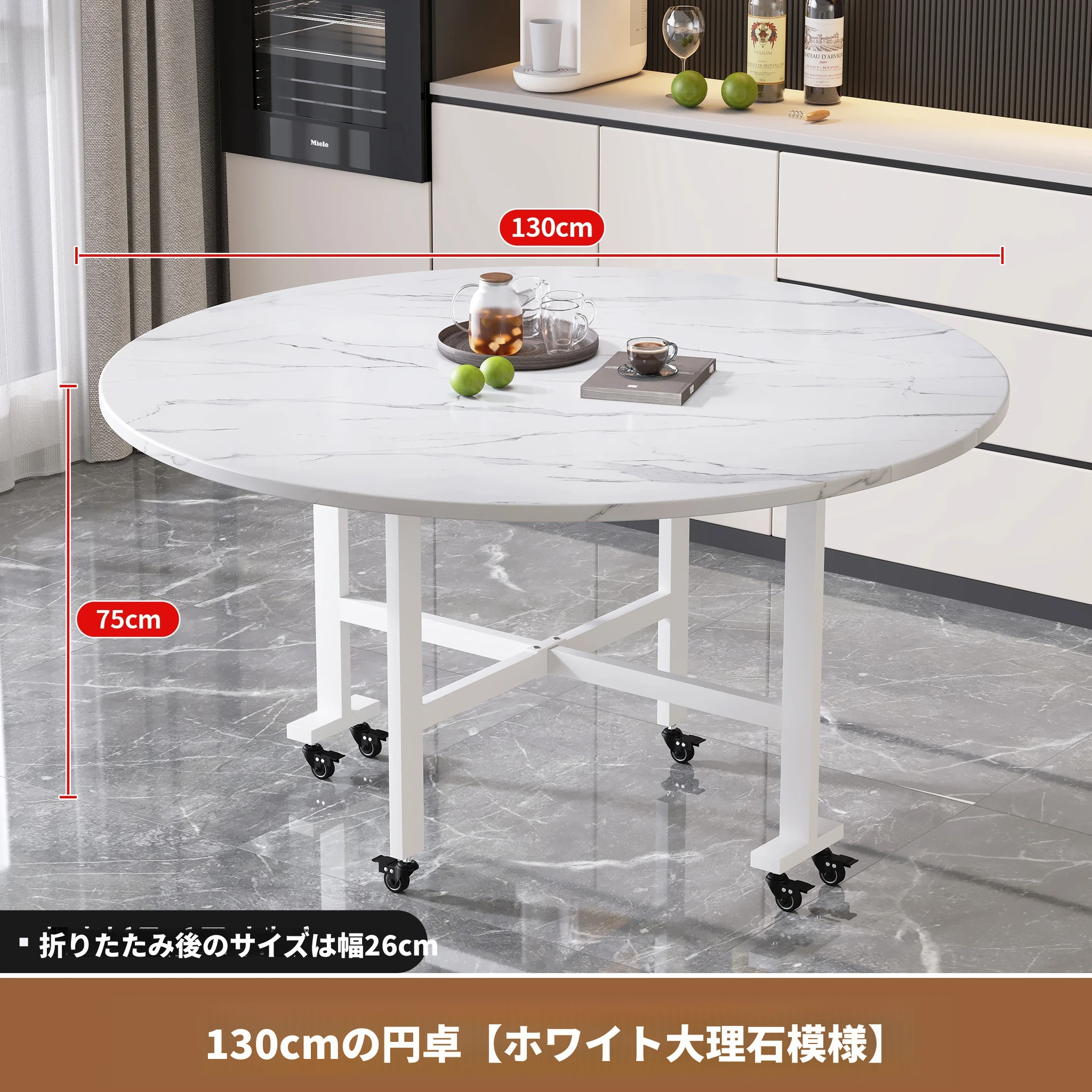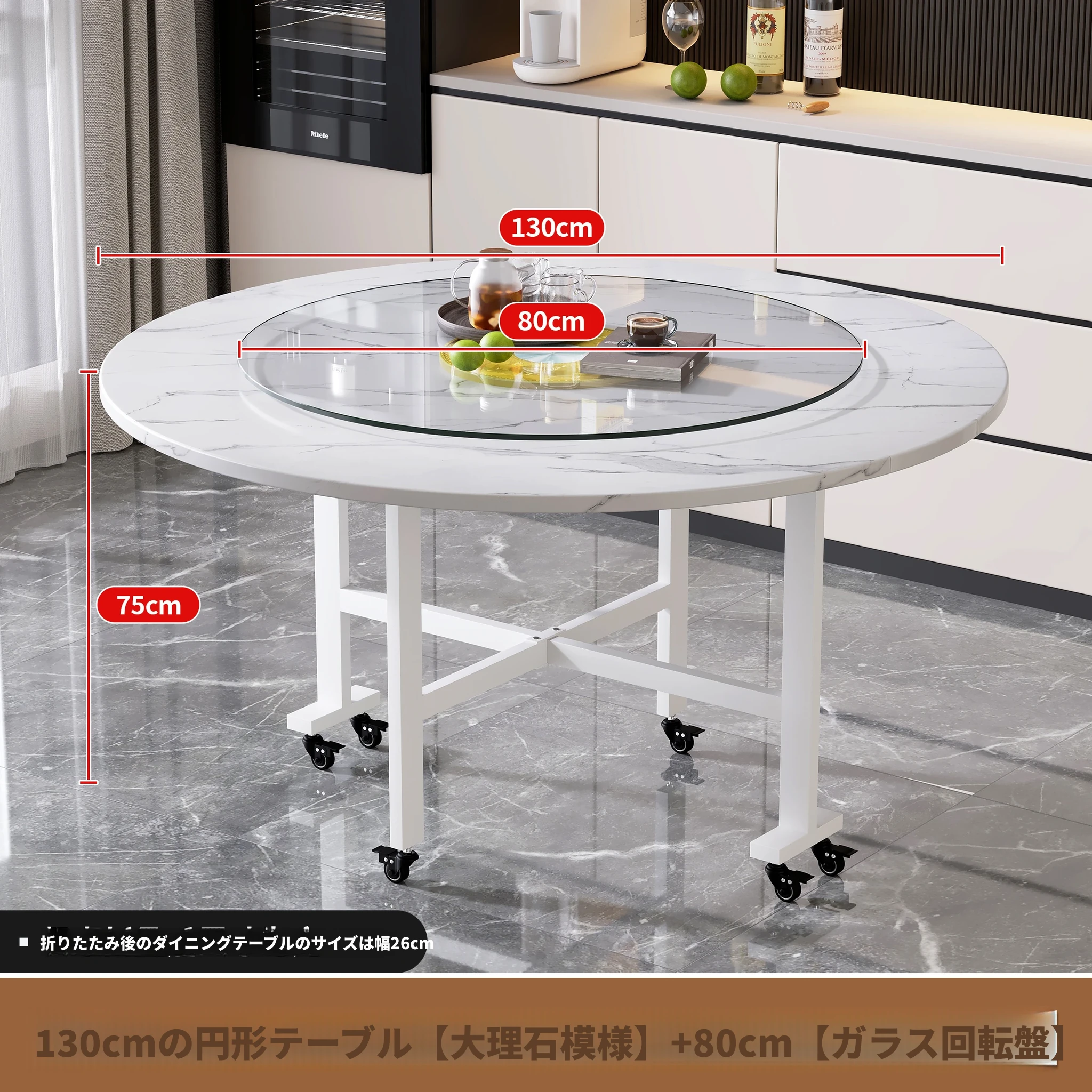 1.3メートル白大理石白脚★キャスター付き+同色0.8ターンテーブル