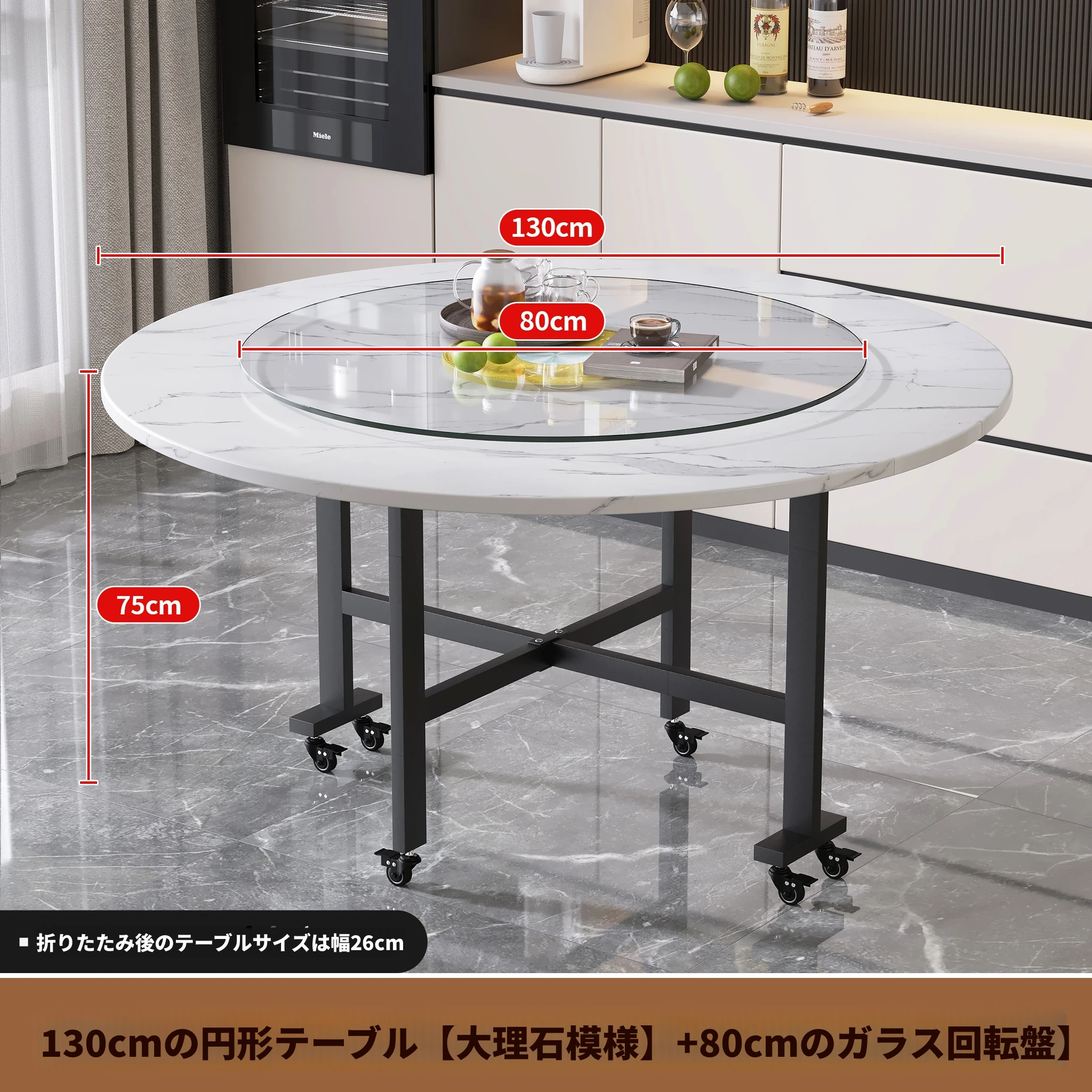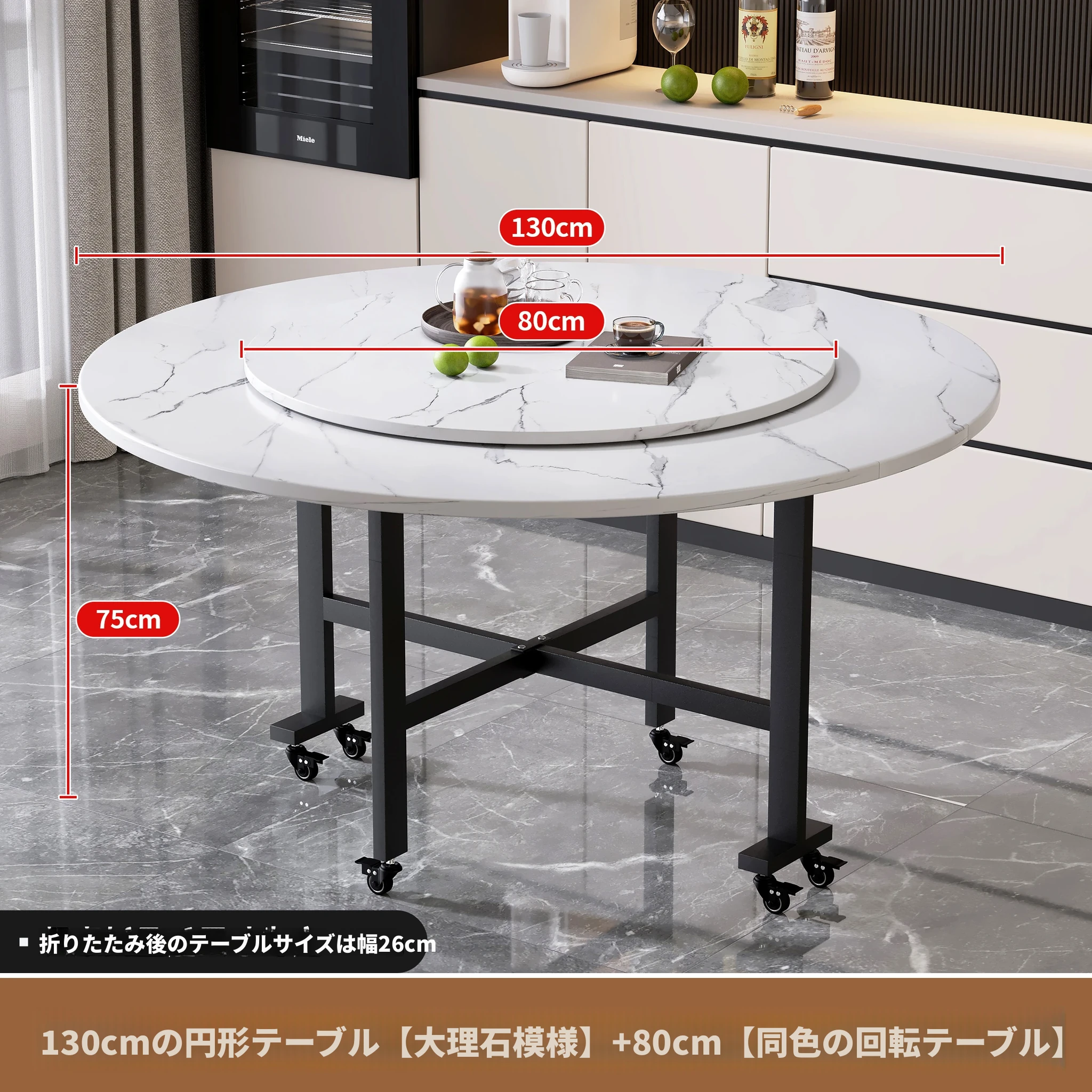 1.3メートル白大理石★キャスター付き+同色0.8ターンテーブル