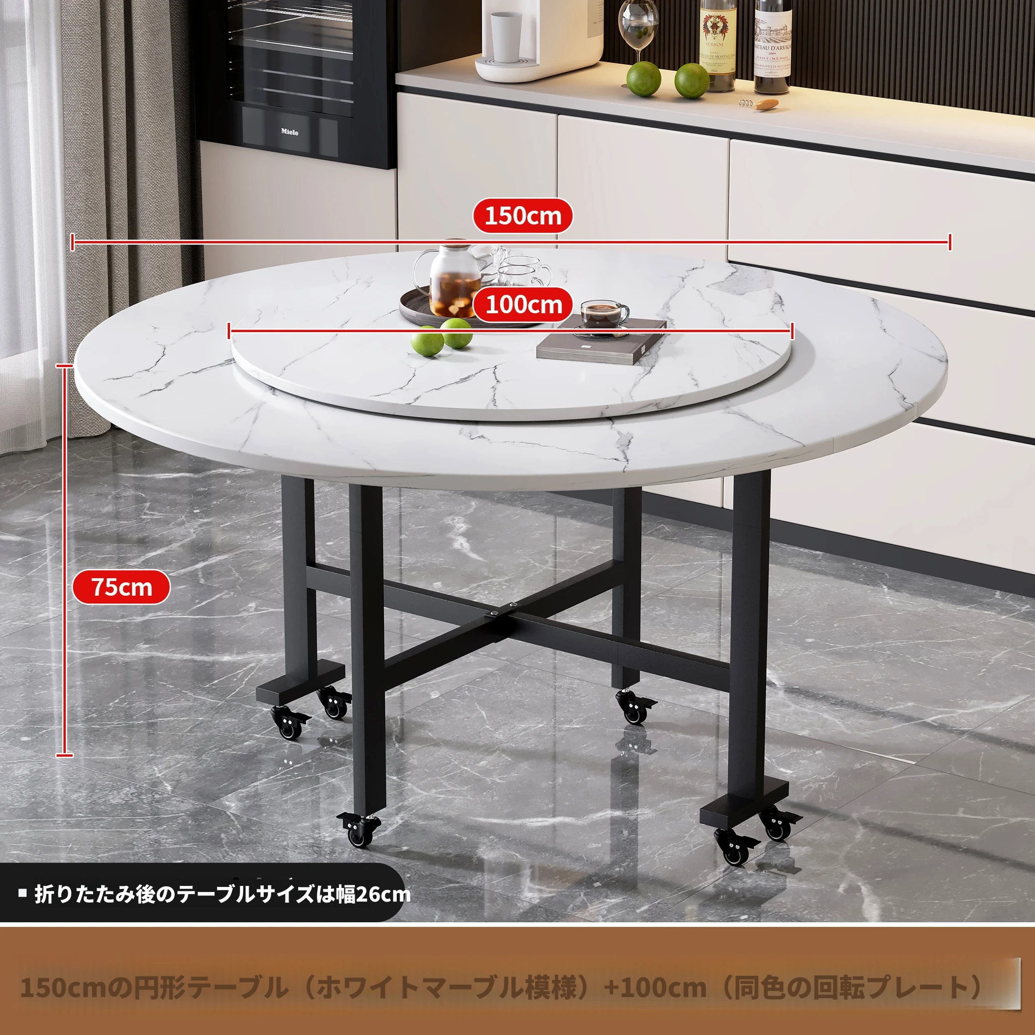 1.5メートル白大理石★キャスター付き+同色1.0ターンテーブル