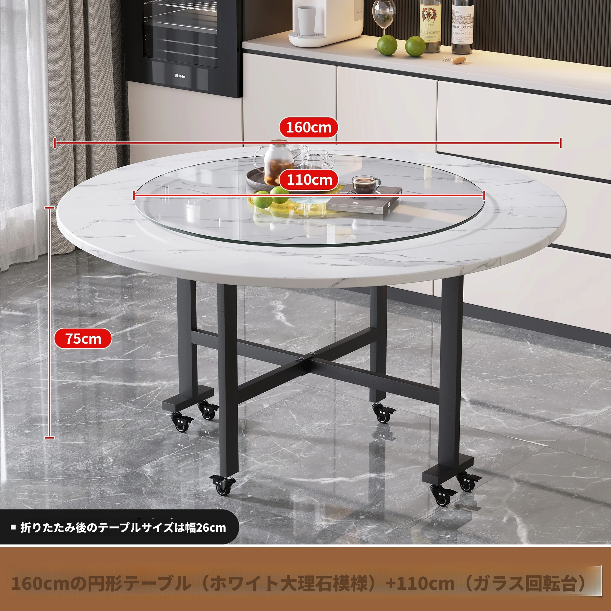 1.6メートル白大理石白脚★キャスター付き+同色1.1ターンテーブル