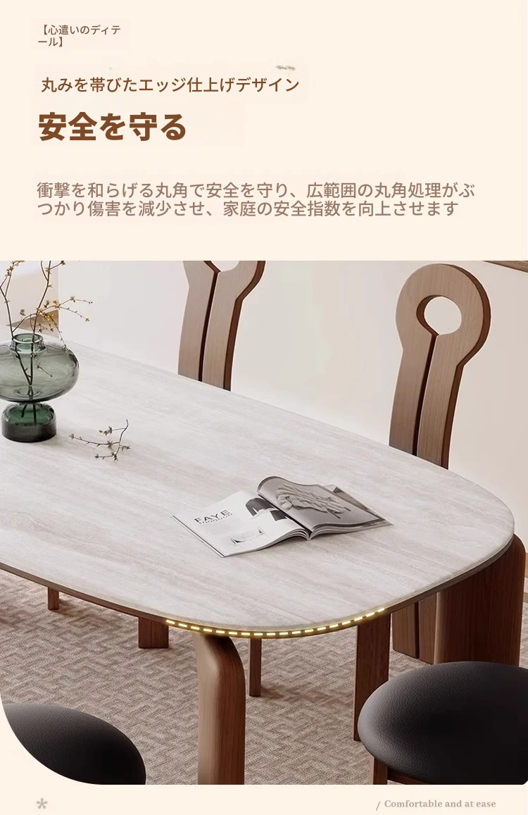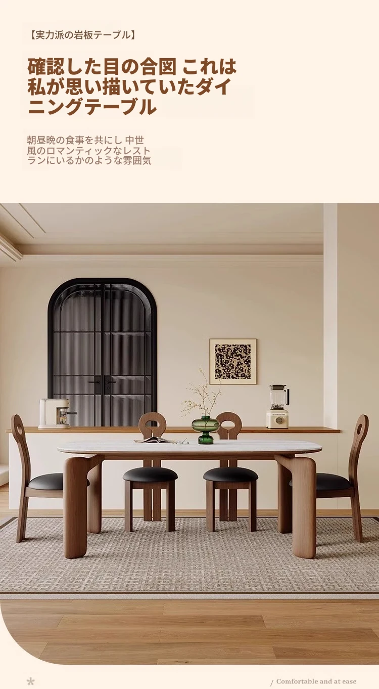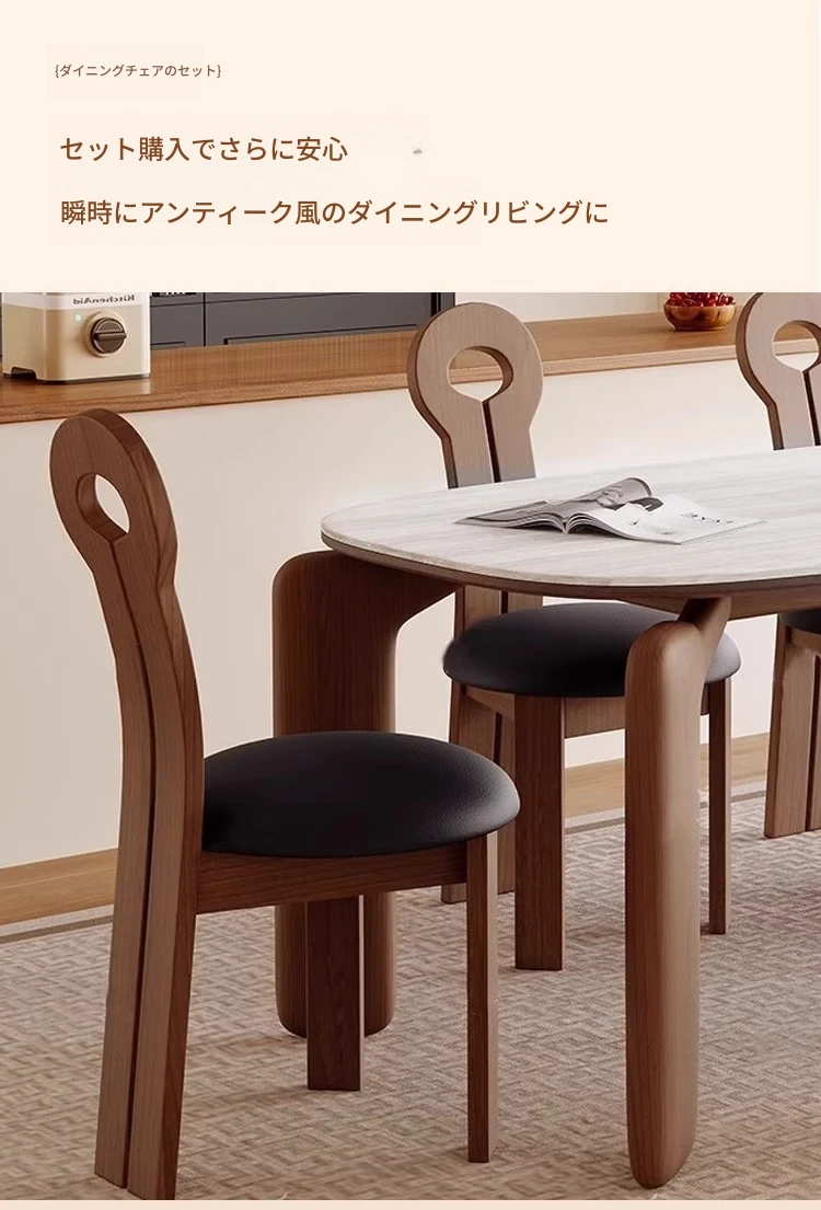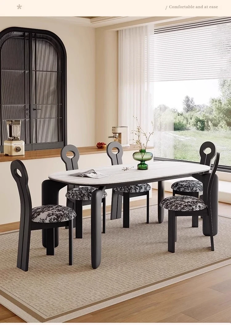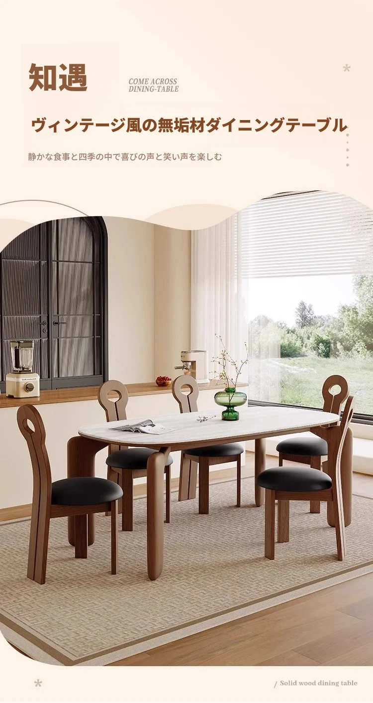 フレンチアンティークスタイルの無垢材ダイニングテーブル - 小さなスペースにぴったり!侘寂風デザインのエレガントな象脚と洞石岩板のオーバルテーブルセットで、食卓をおしゃれに演出します。