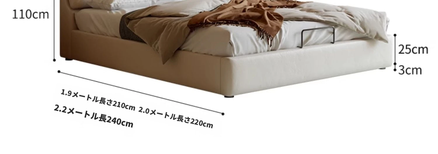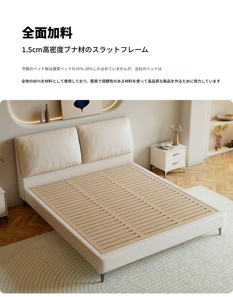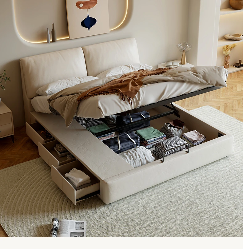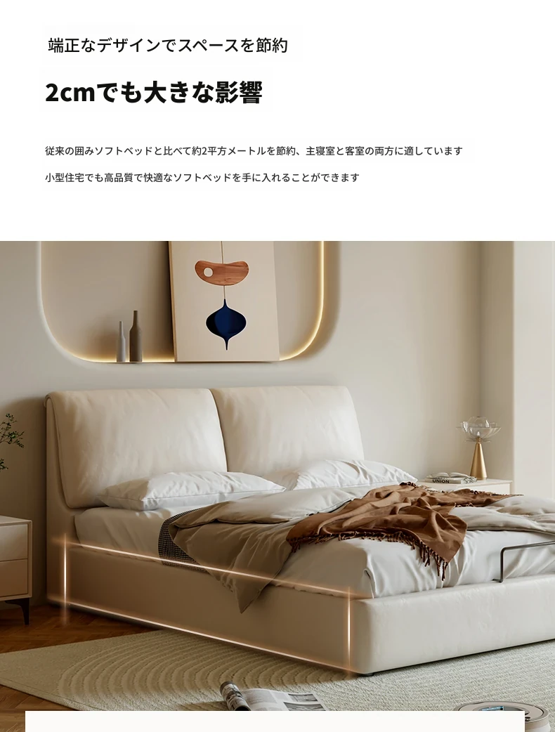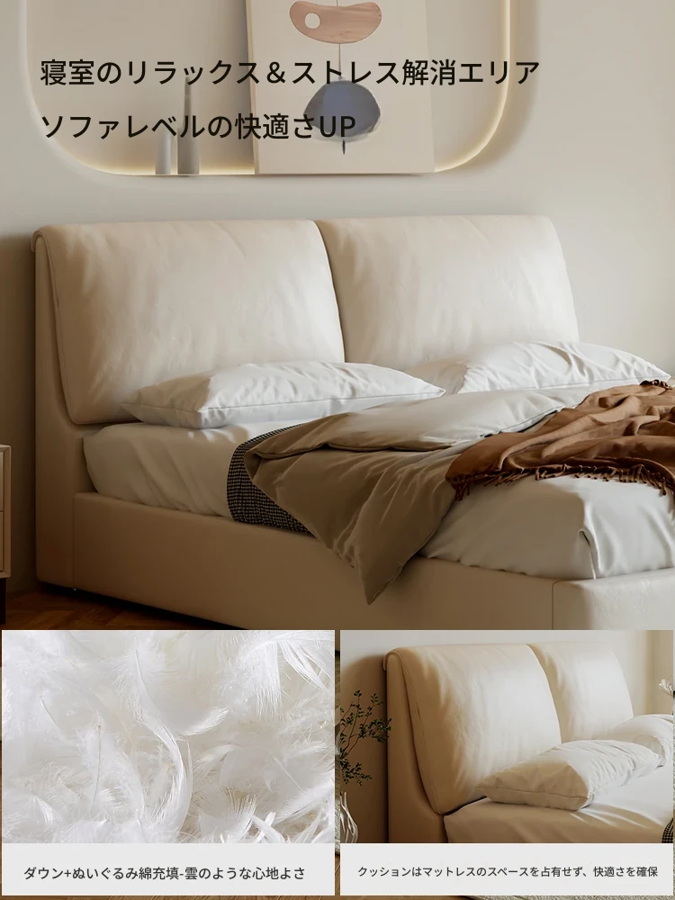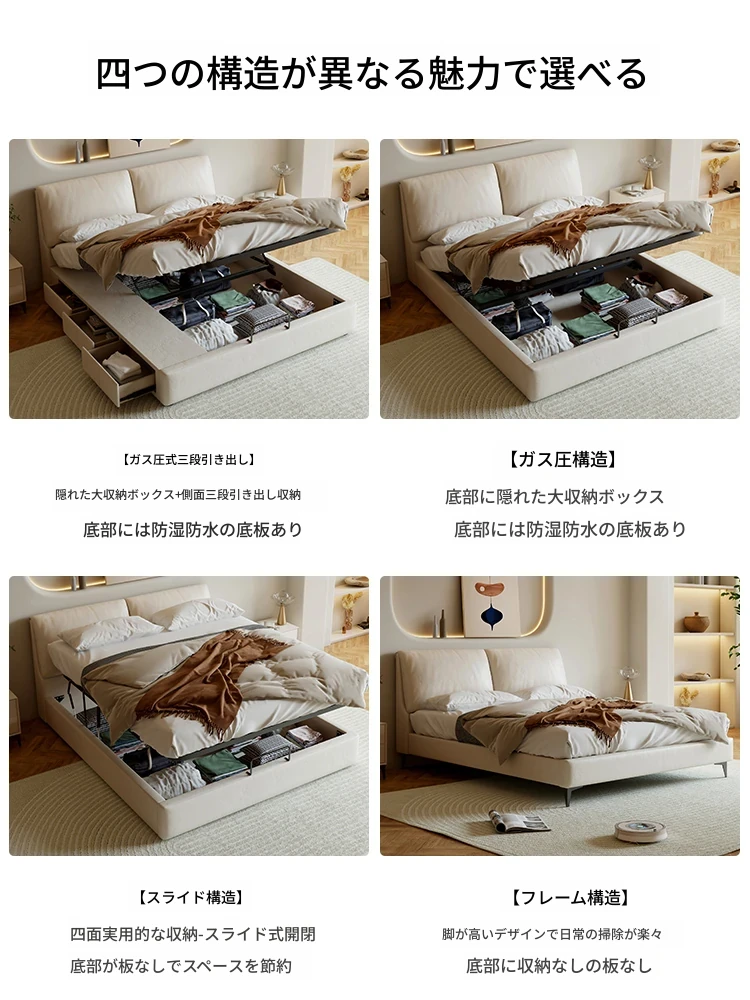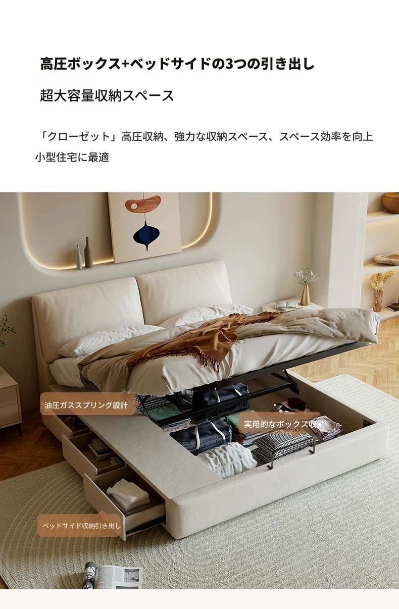 本革製ダブルベッド 大きな耳のデザイン 1.8m 小型住宅向け ヘッドレザー使用の高品質牛革 クリーミー風 抽斗収納ベッドでお部屋をスッキリ整理!