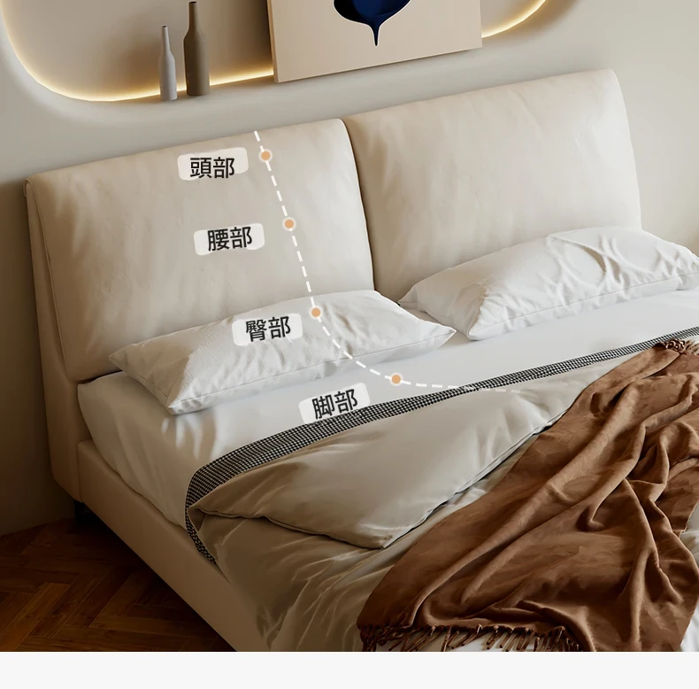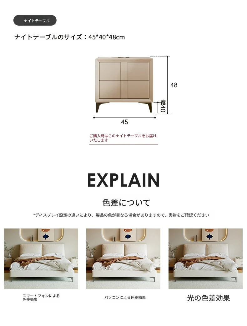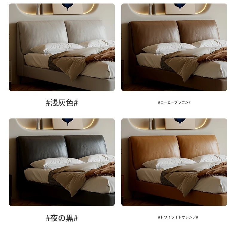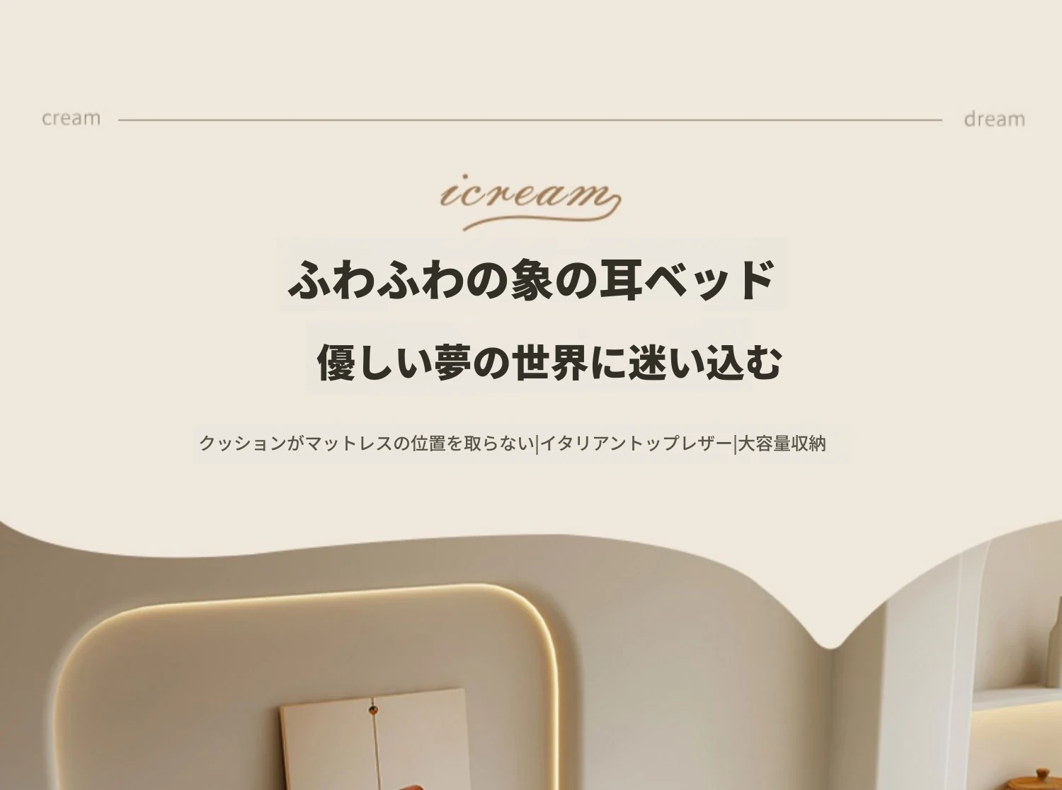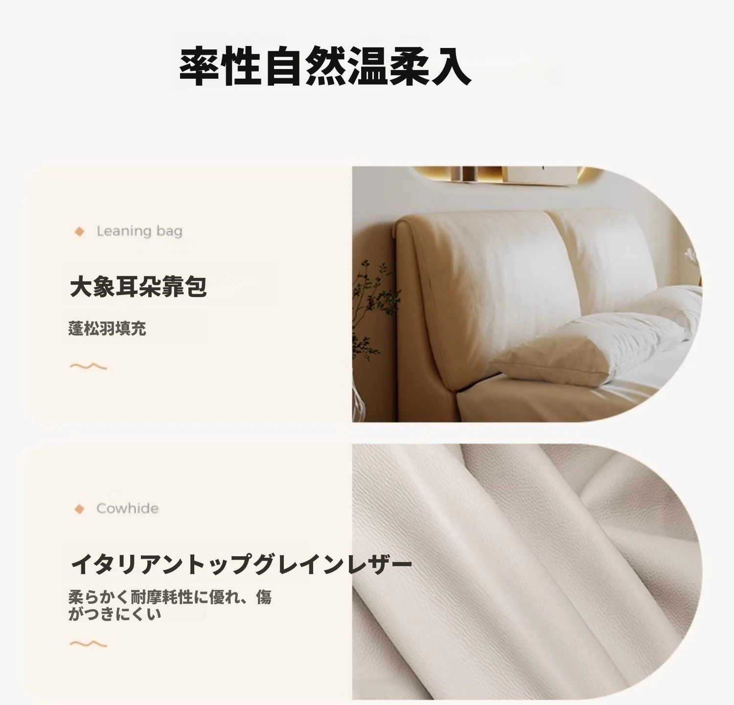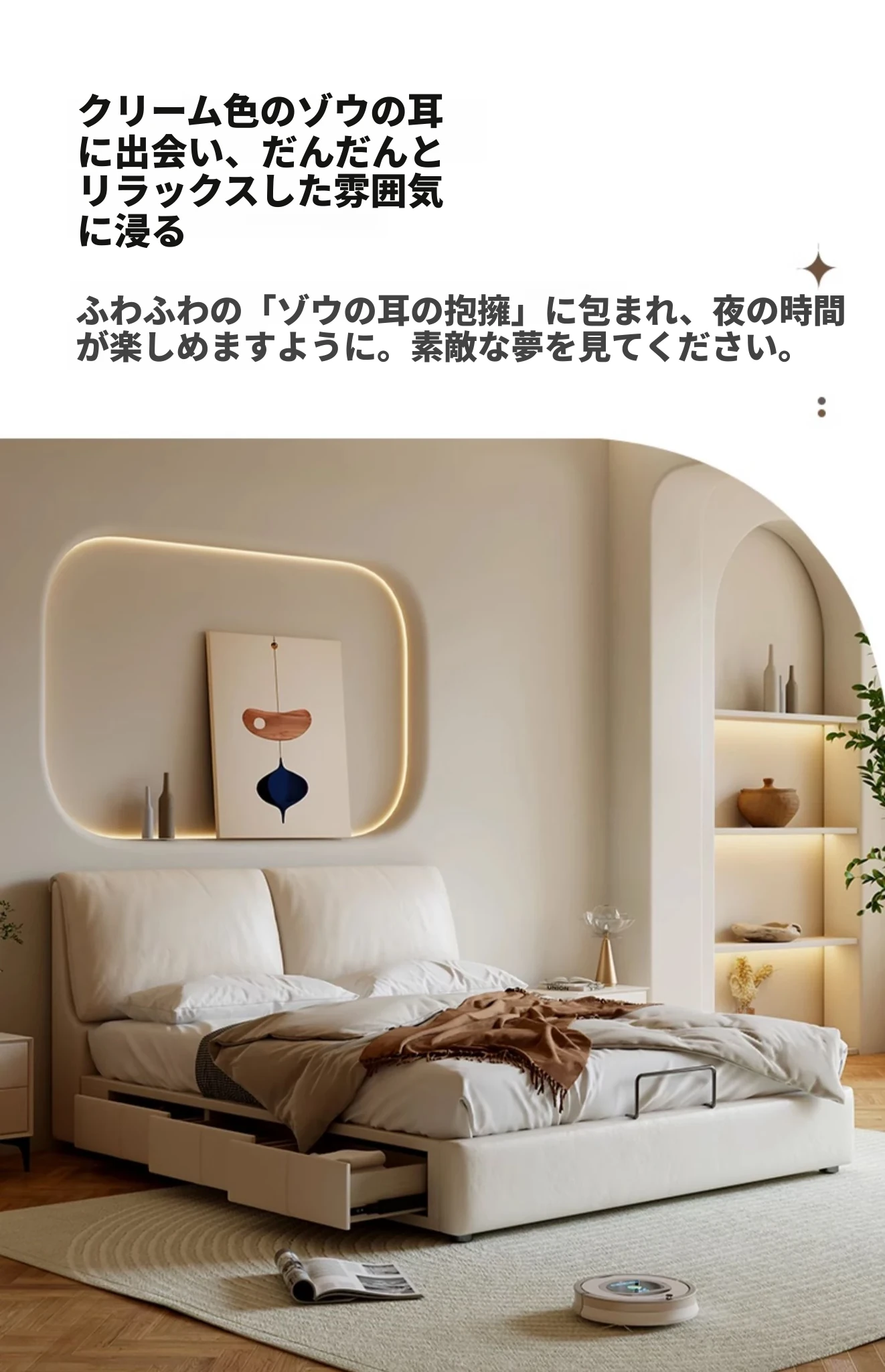 本革製ダブルベッド 大きな耳のデザイン 1.8m 小型住宅向け ヘッドレザー使用の高品質牛革 クリーミー風 抽斗収納ベッドでお部屋をスッキリ整理!