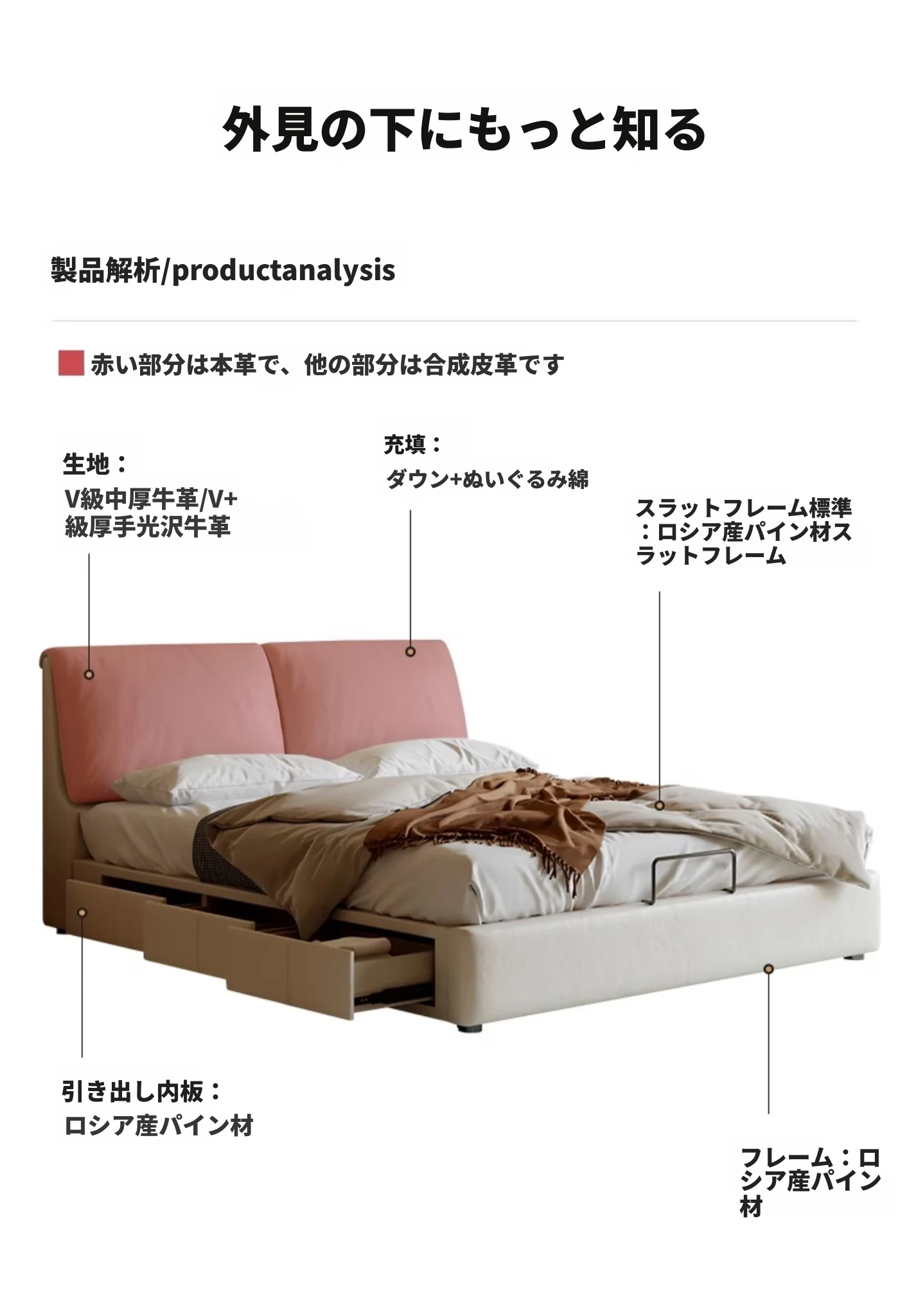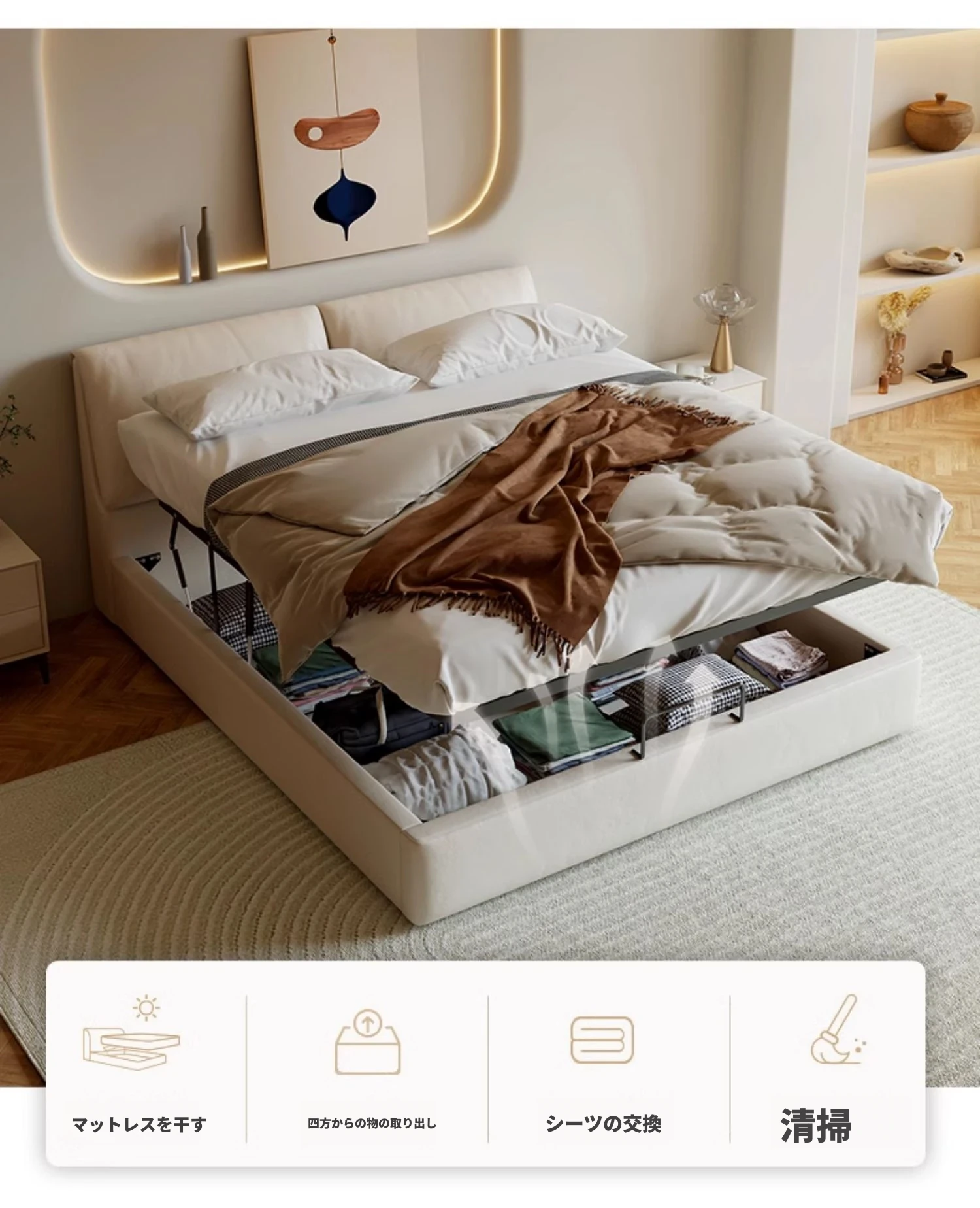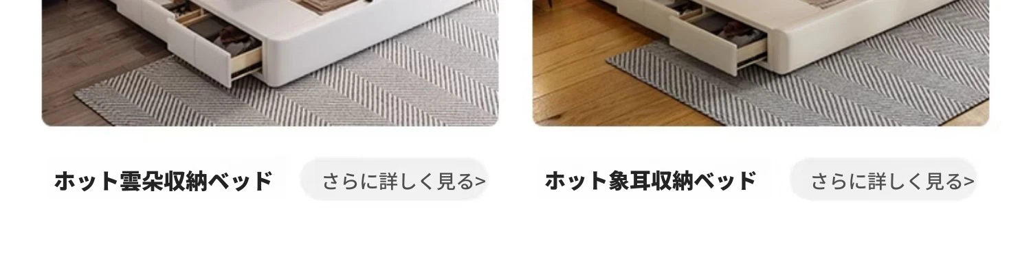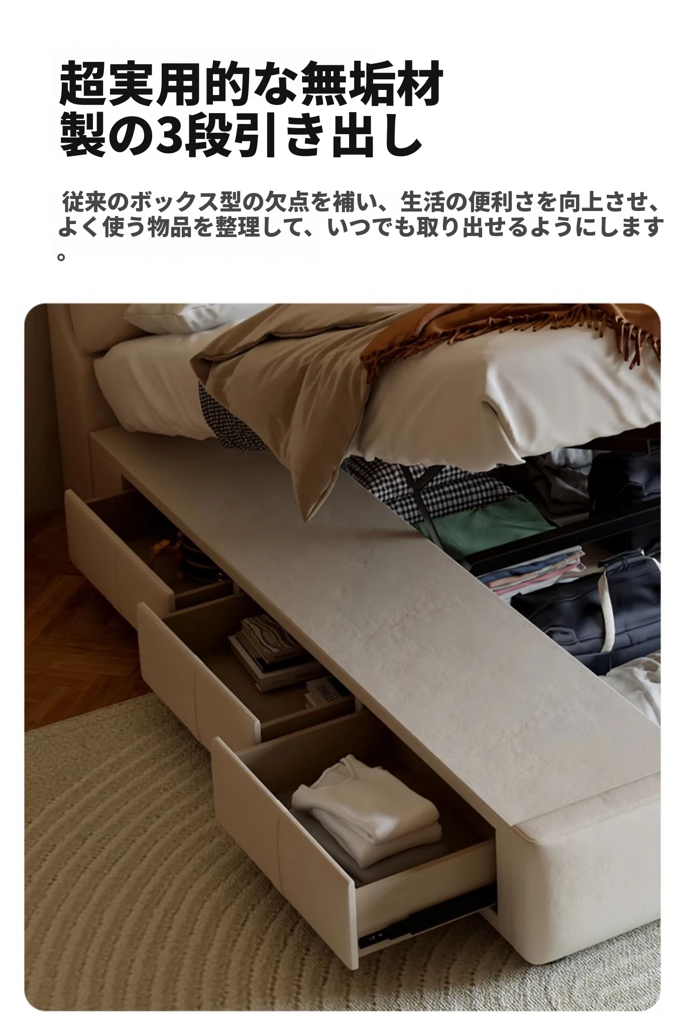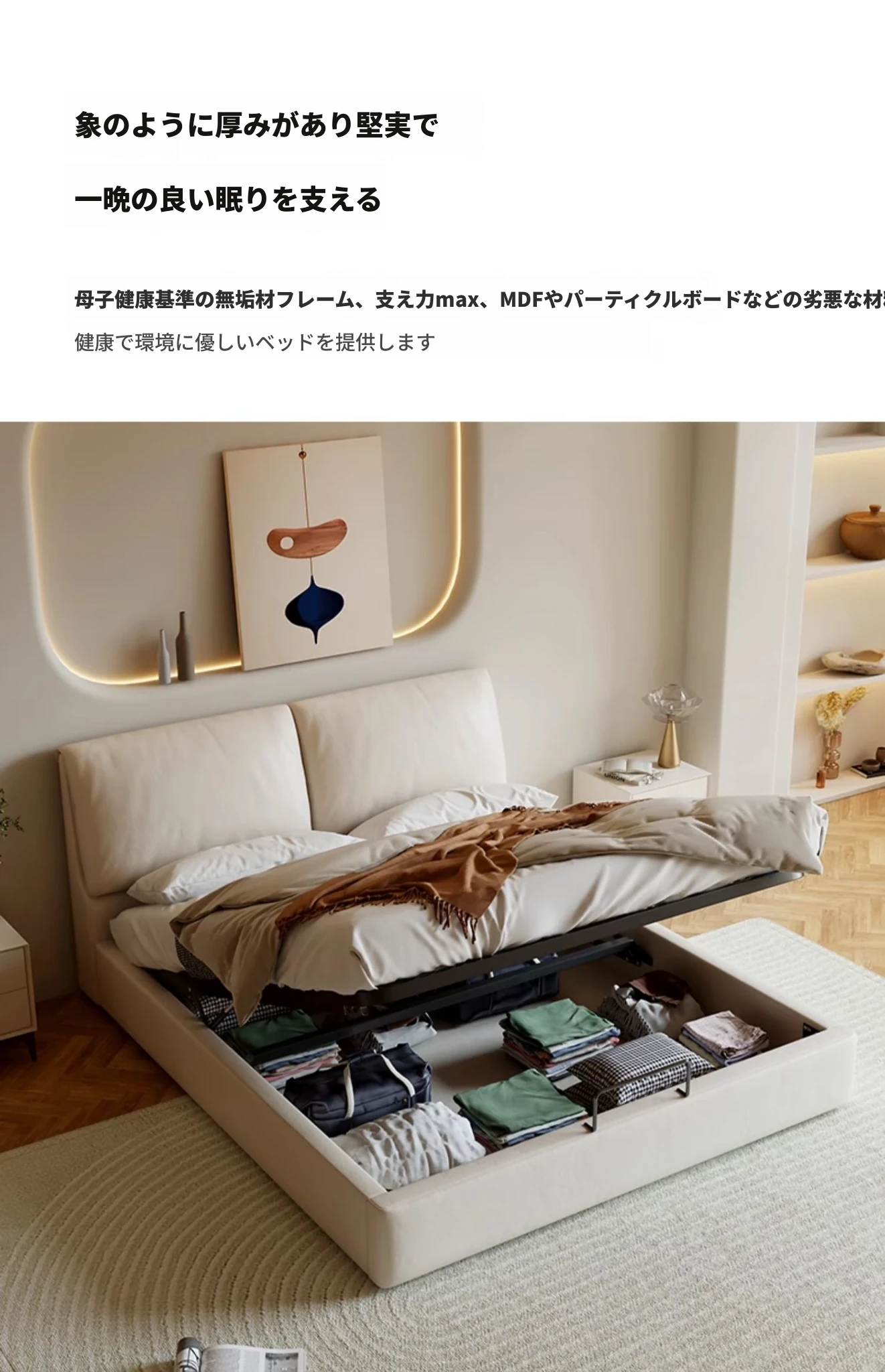 本革製ダブルベッド 大きな耳のデザイン 1.8m 小型住宅向け ヘッドレザー使用の高品質牛革 クリーミー風 抽斗収納ベッドでお部屋をスッキリ整理!