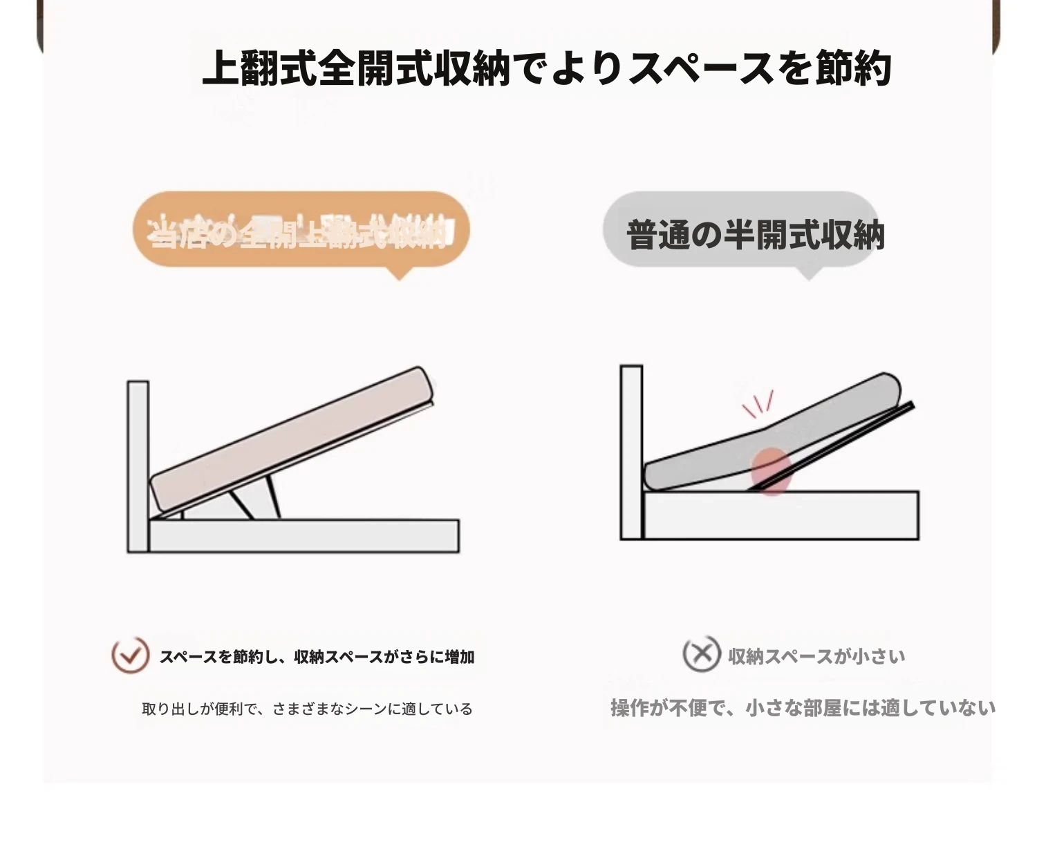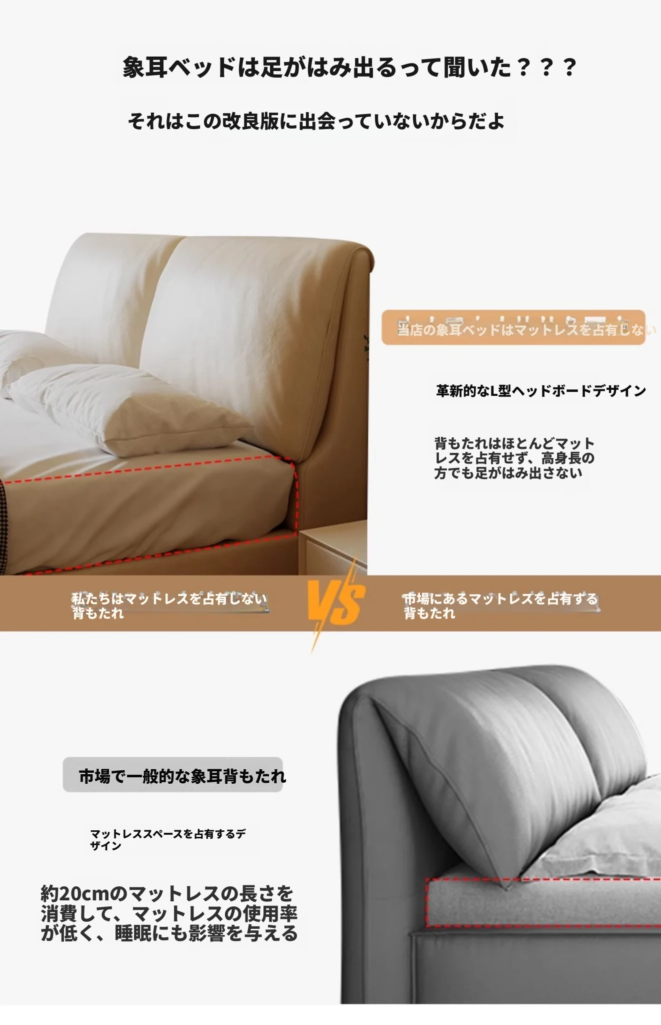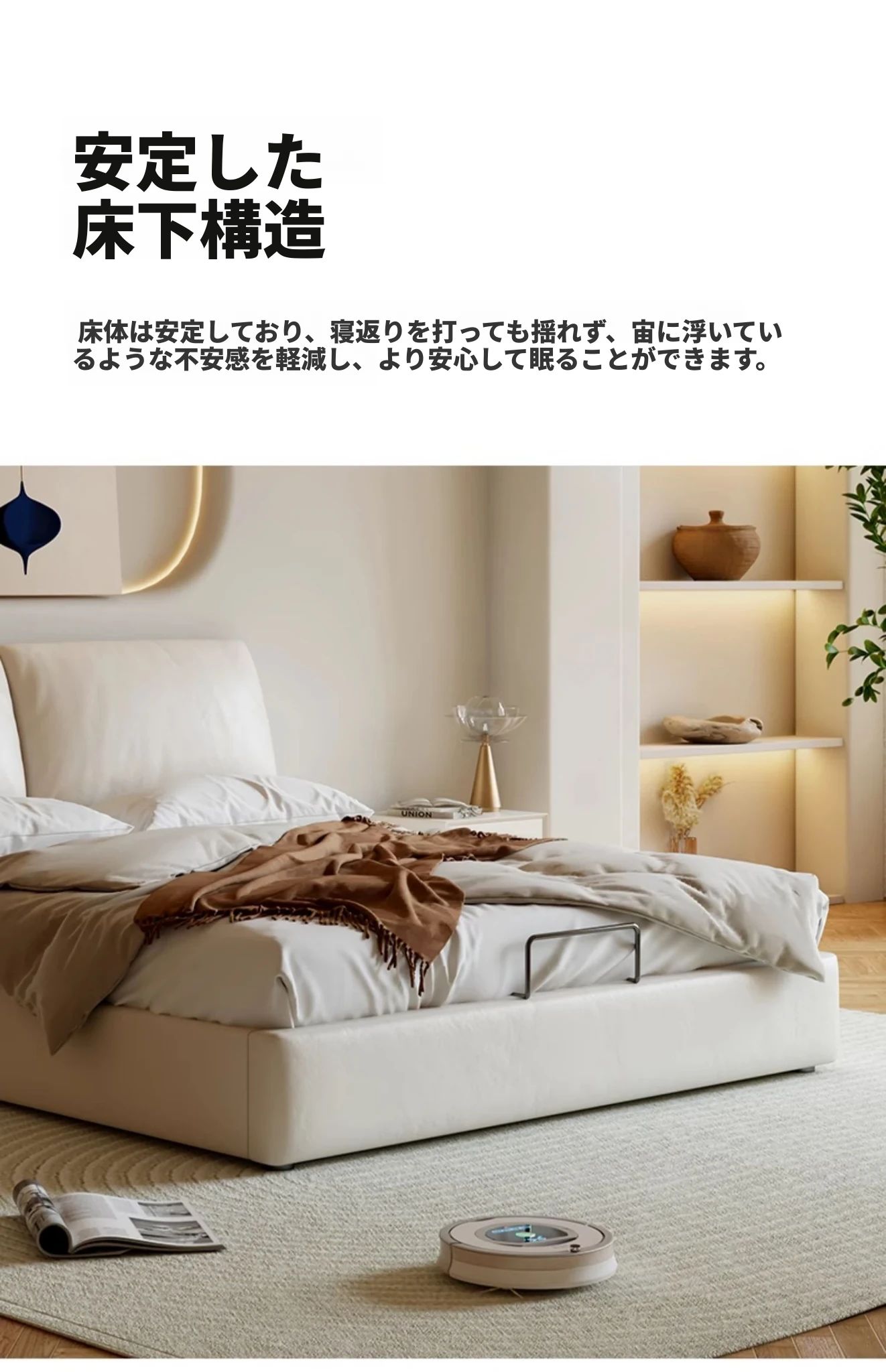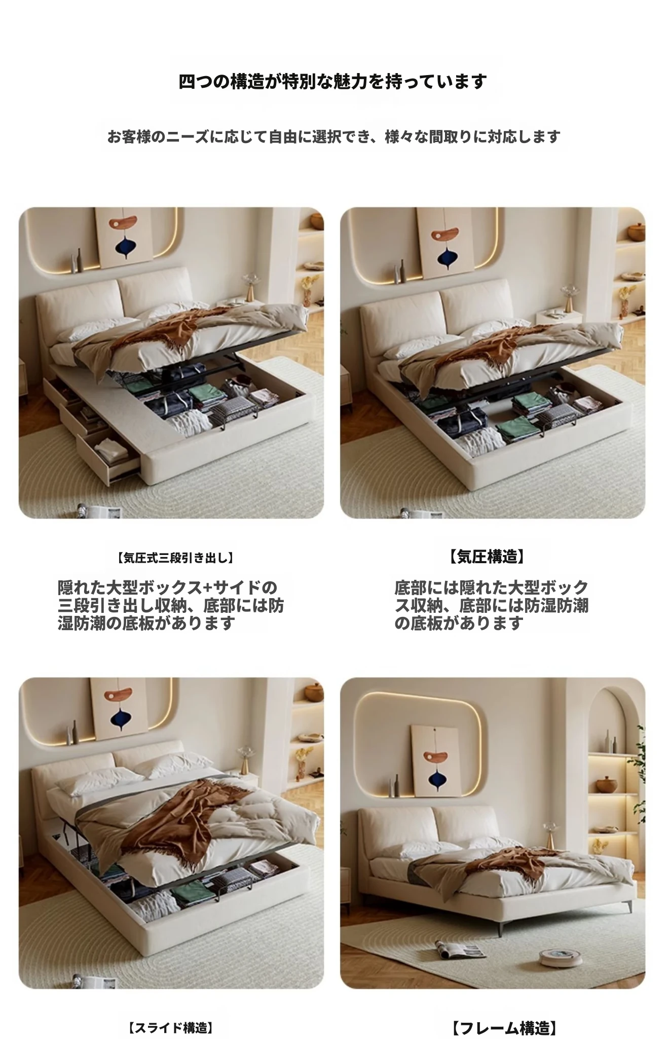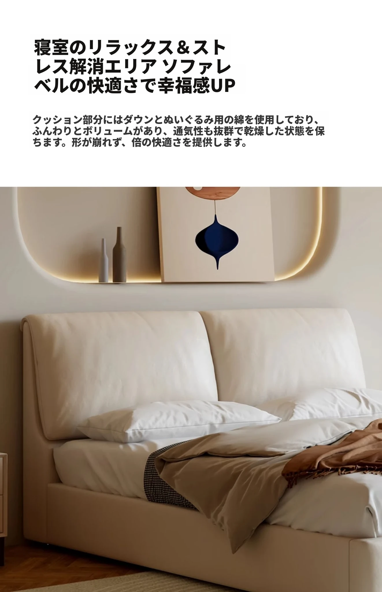 本革製ダブルベッド 大きな耳のデザイン 1.8m 小型住宅向け ヘッドレザー使用の高品質牛革 クリーミー風 抽斗収納ベッドでお部屋をスッキリ整理!
