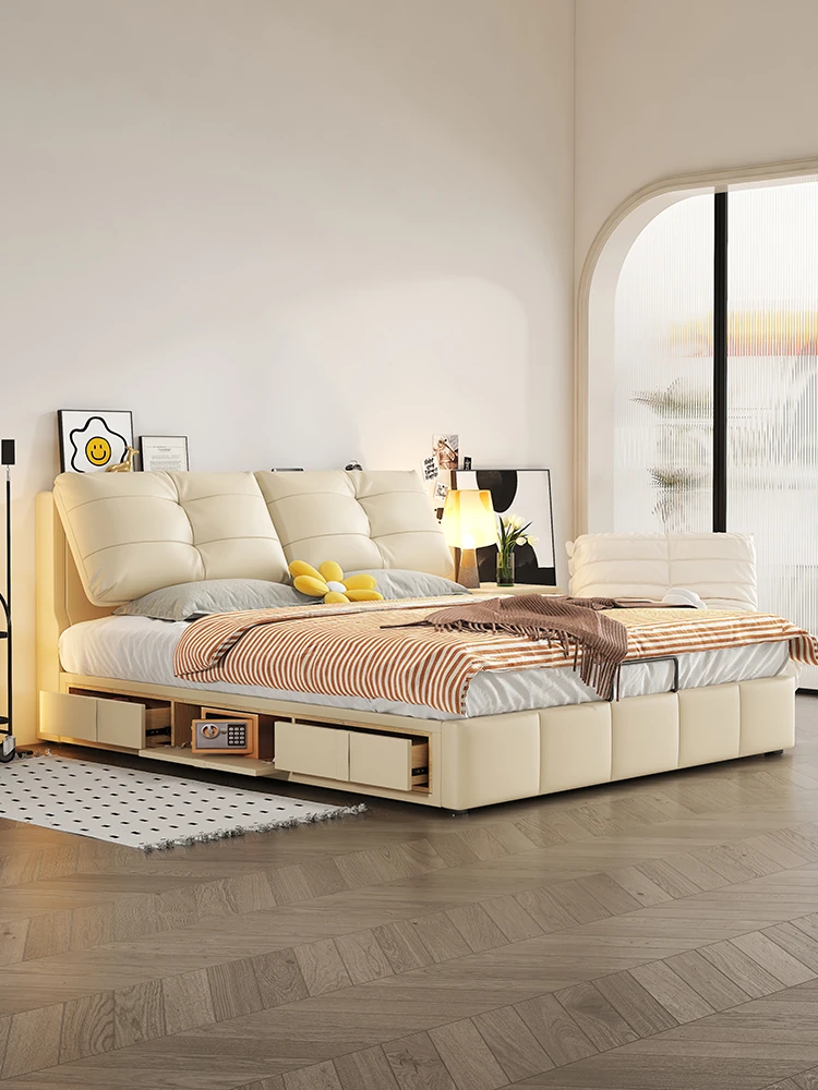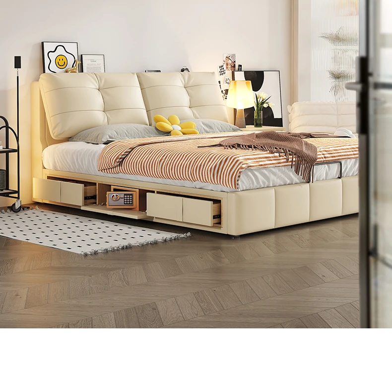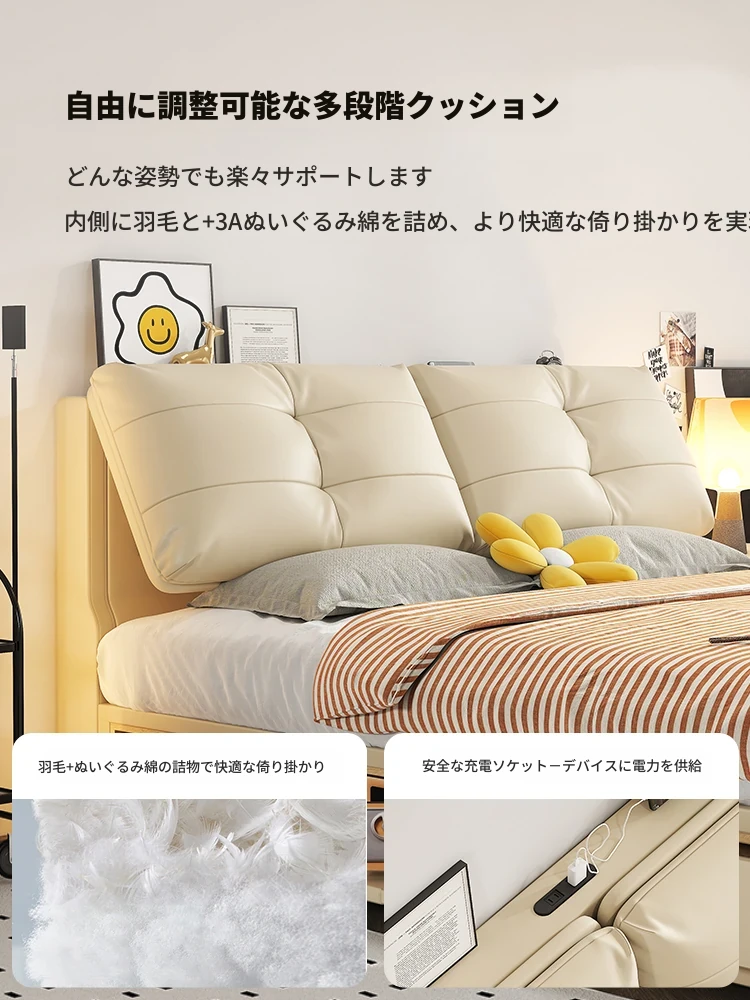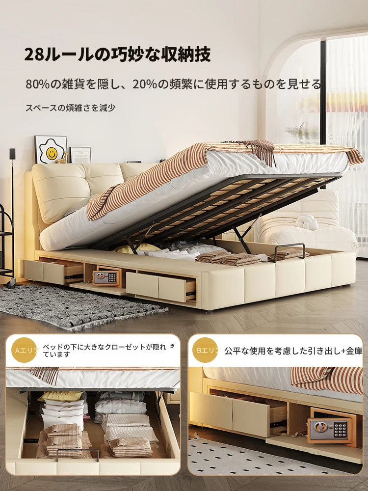 【ご購入必見】極上の快適さ&収納力!本革使用の侘び寂び風ダブルベッド。小スペースでも収納たっぷり、高級感あるデザインは新婚主寝室に最適です!