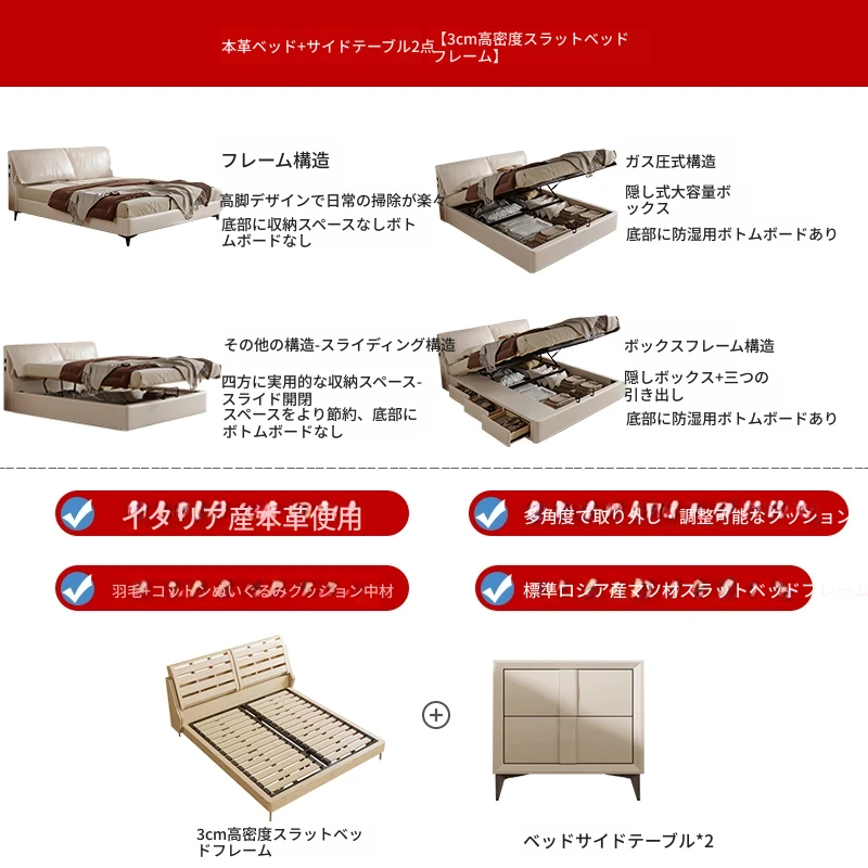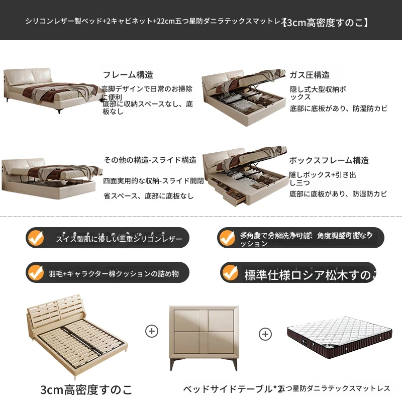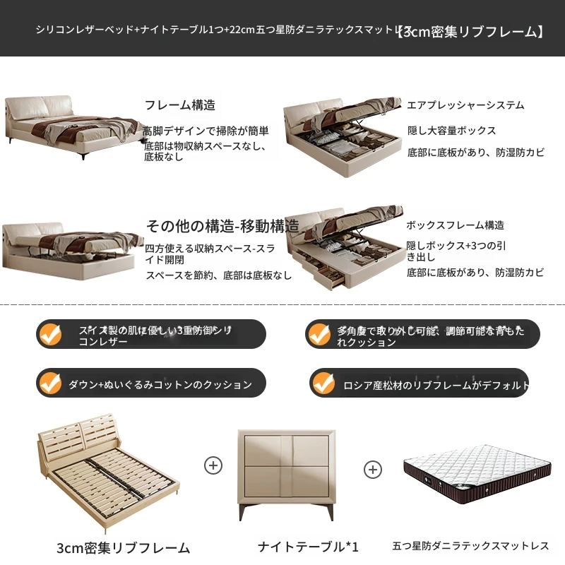 トップグレインレザーベッド+1ナイトスタンド+22cm五つ星防ダニラテックスマットレス