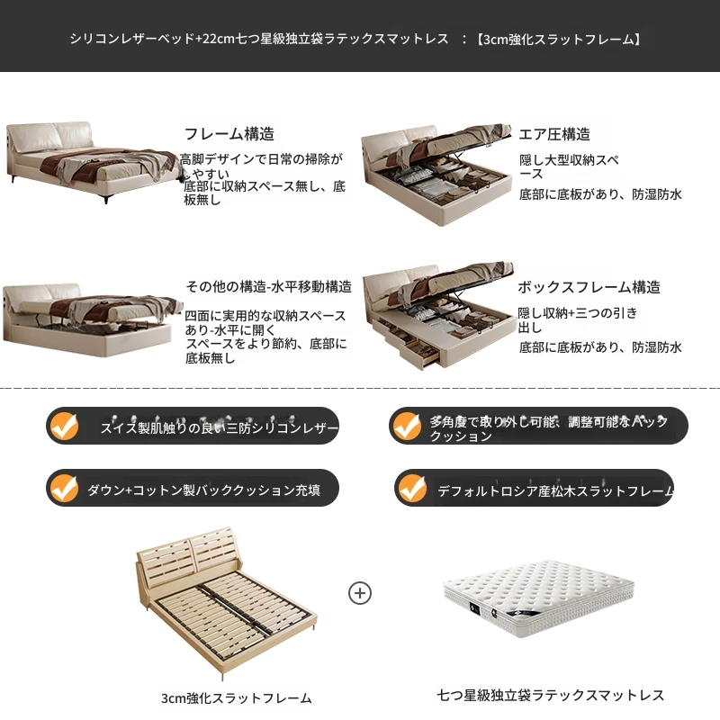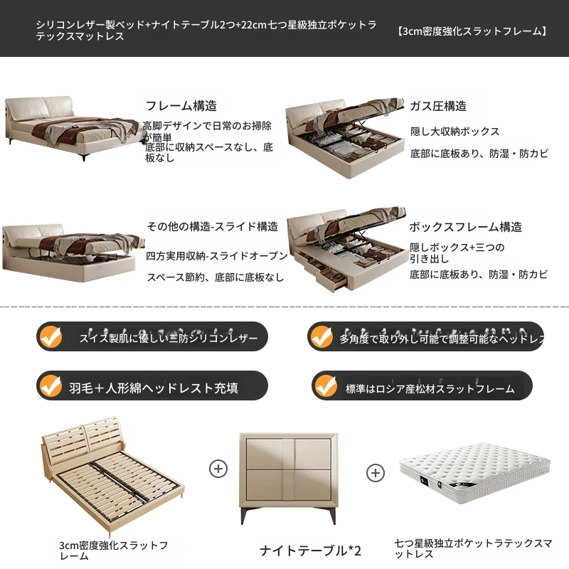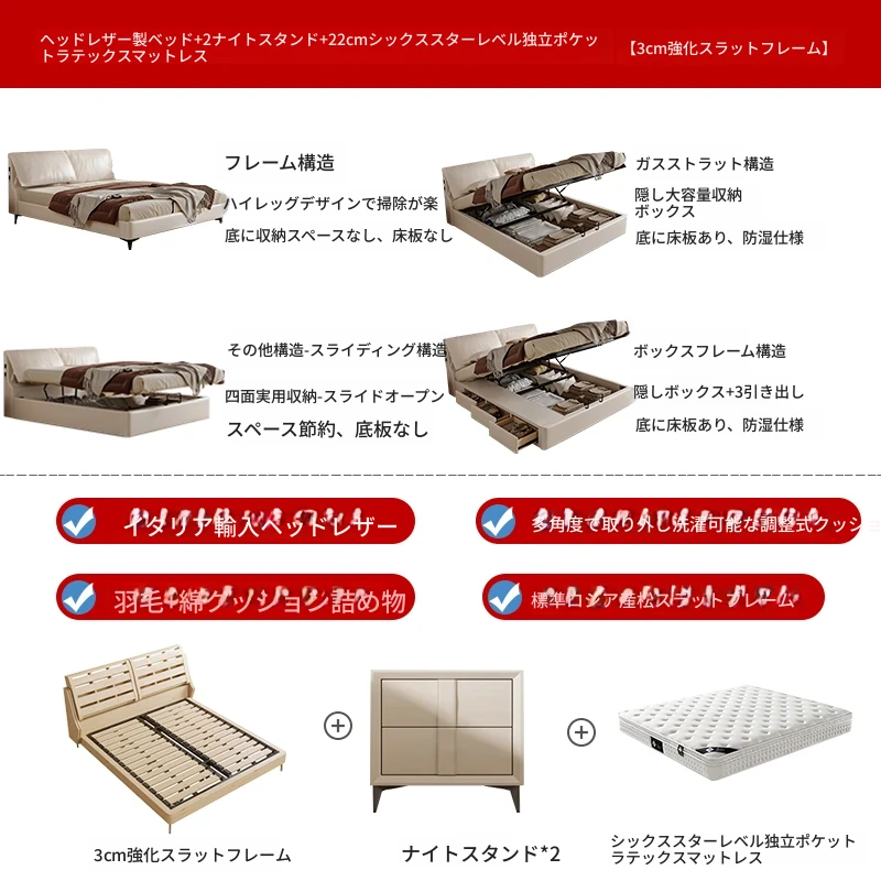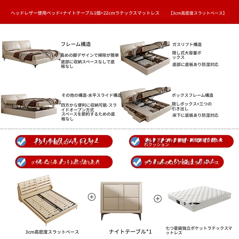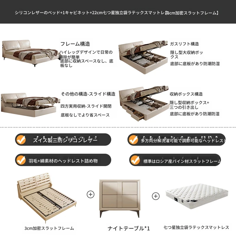 トップグレインレザーベッド+1ナイトスタンド+22cm七つ星独立ポケットラテックスマットレス