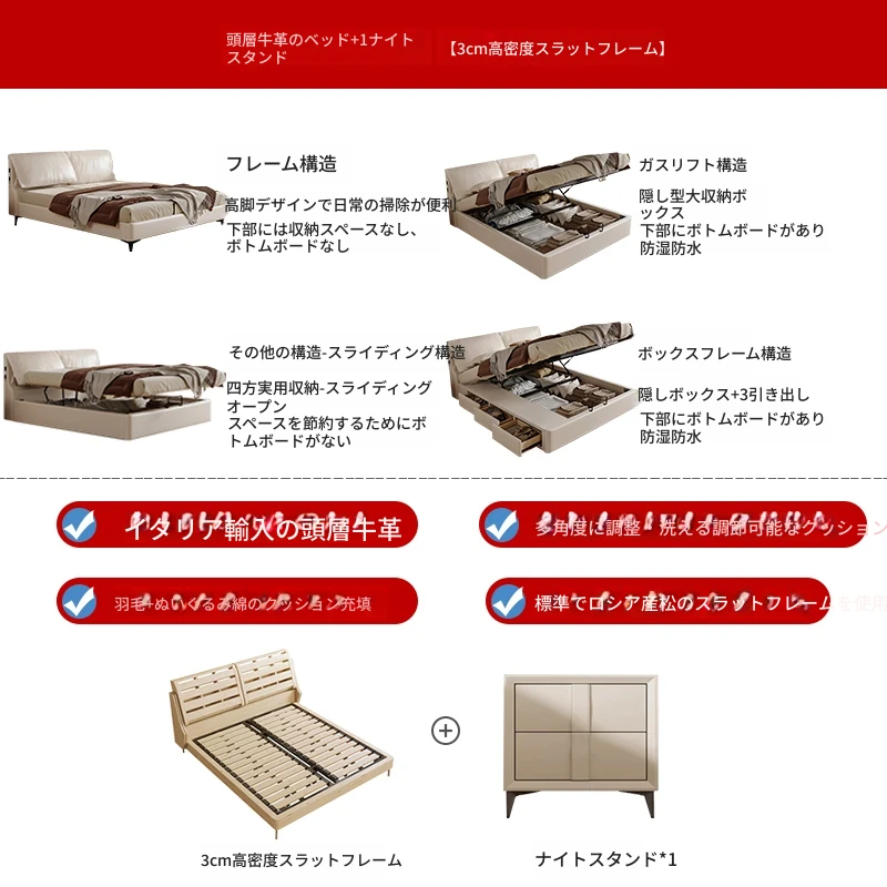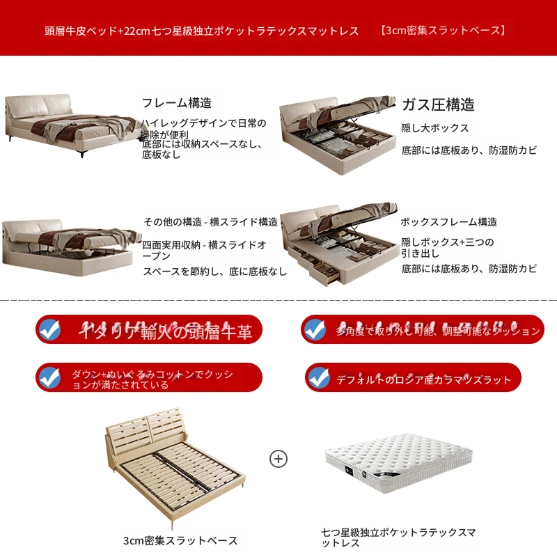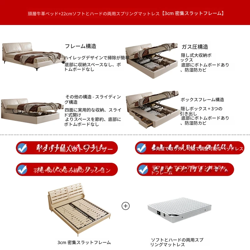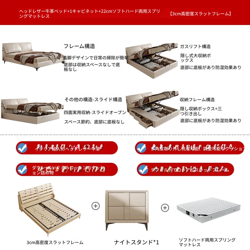 トップグレインレザーベッド+1ナイトスタンド+22cm硬軟両用スプリングマットレス