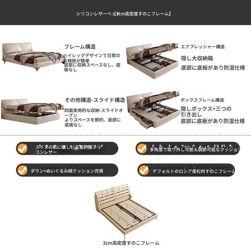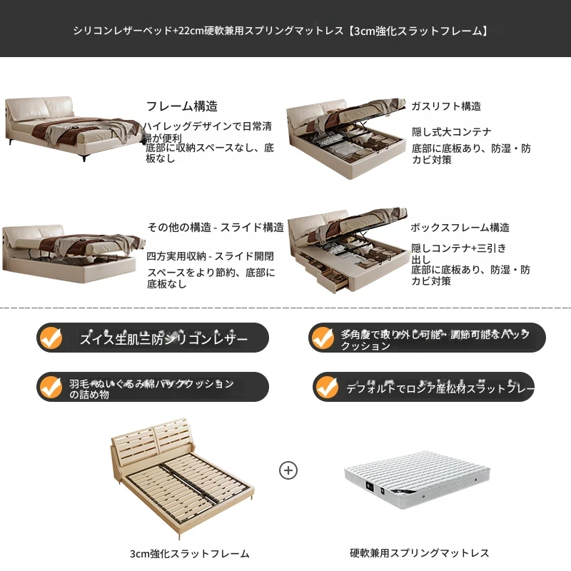 トップグレインレザーベッド+22cm硬軟両用スプリングマットレス