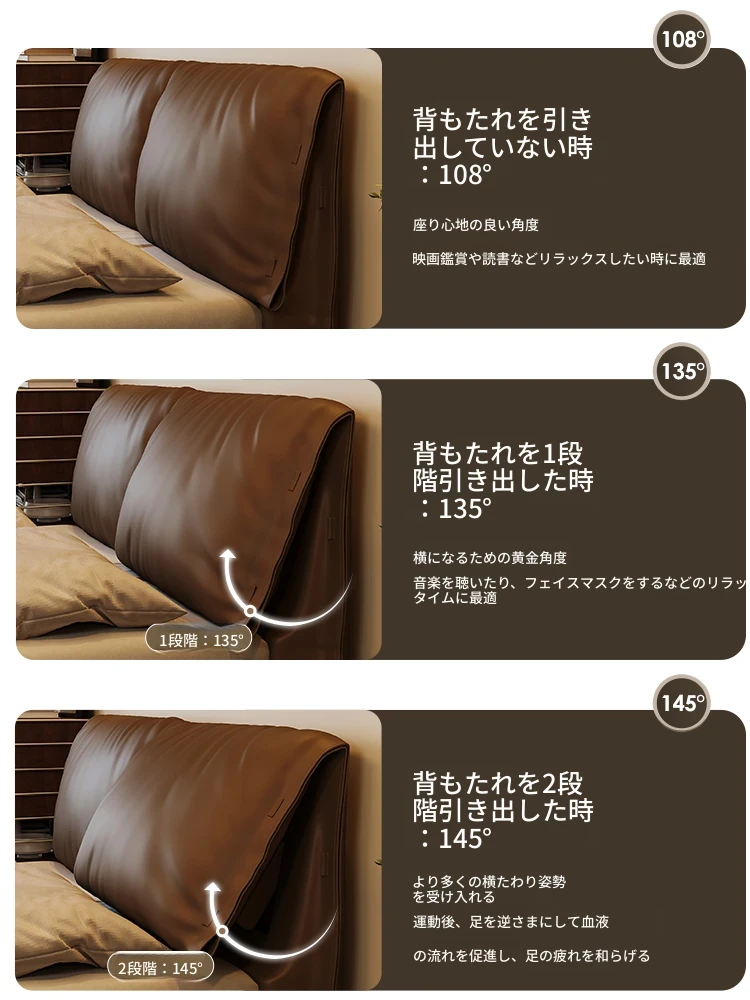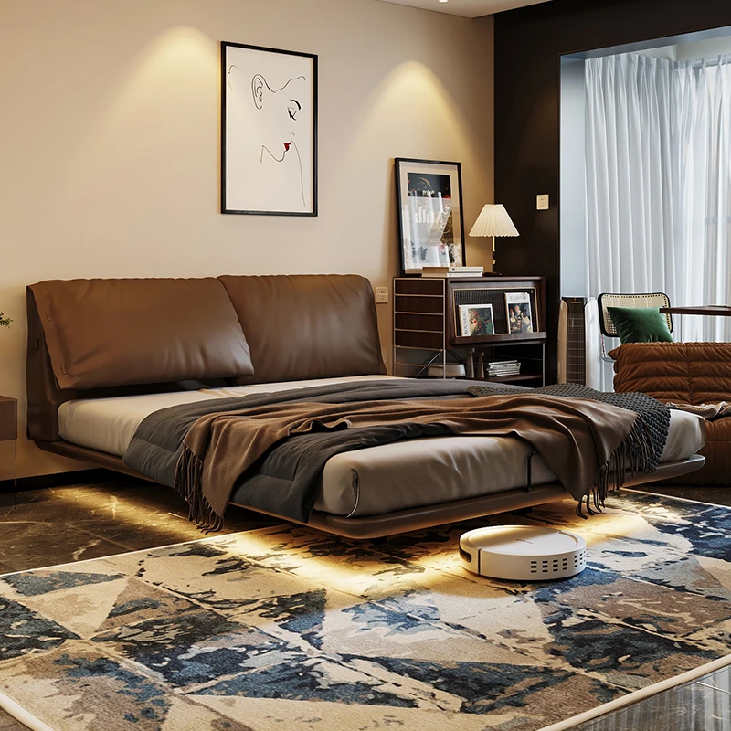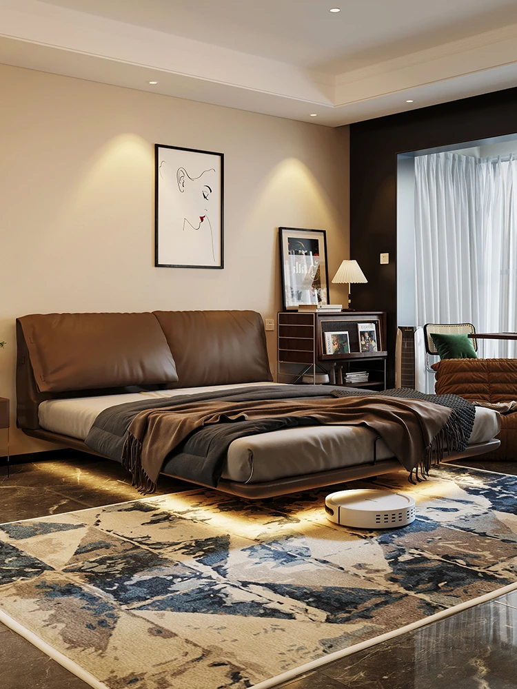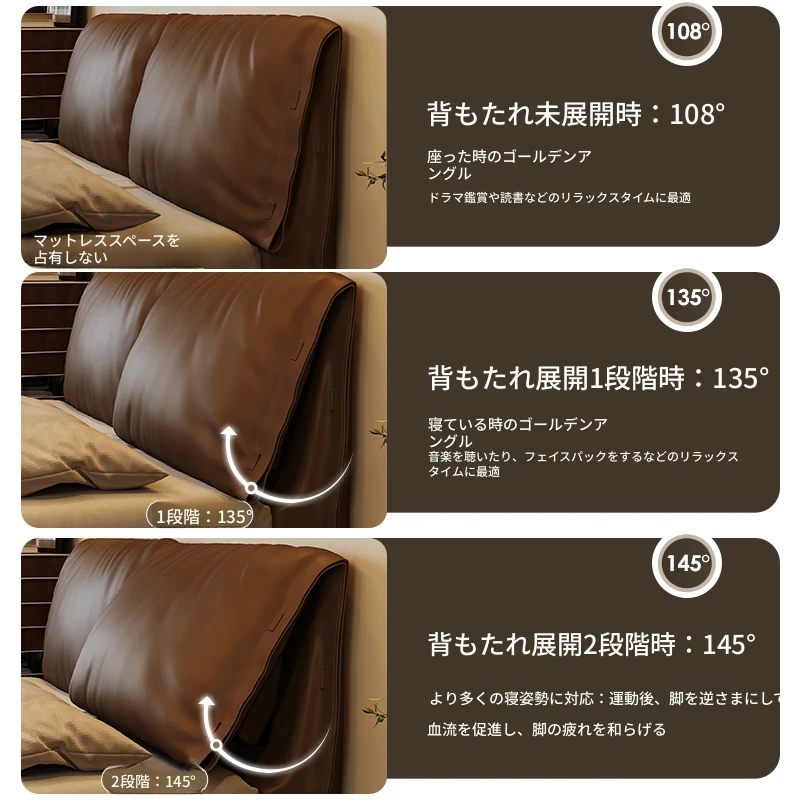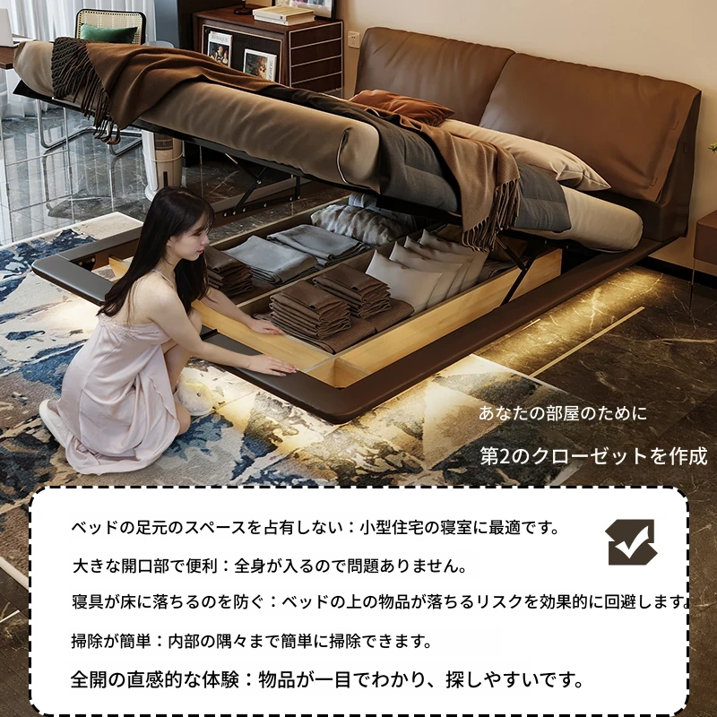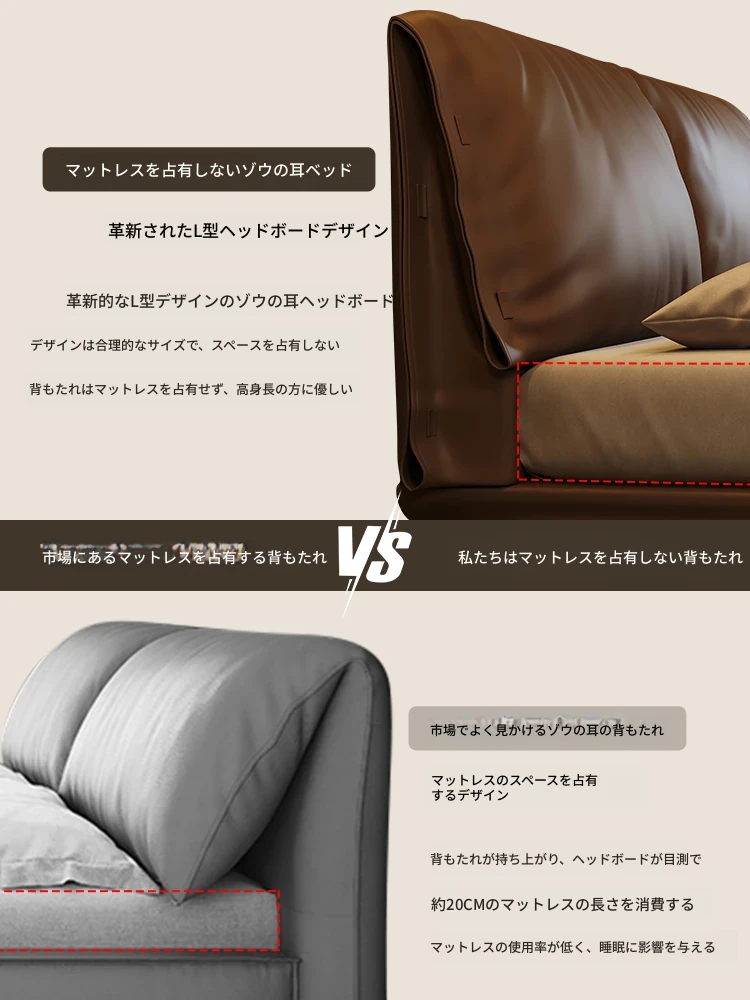 エレガントな象耳デザインの本革ベッド - モダンでシンプルな主寝室用ダブル豪華ソフトパックベッド、浮遊式ストレージ機能付き!高級感溢れる快適な睡眠空間を実現します。