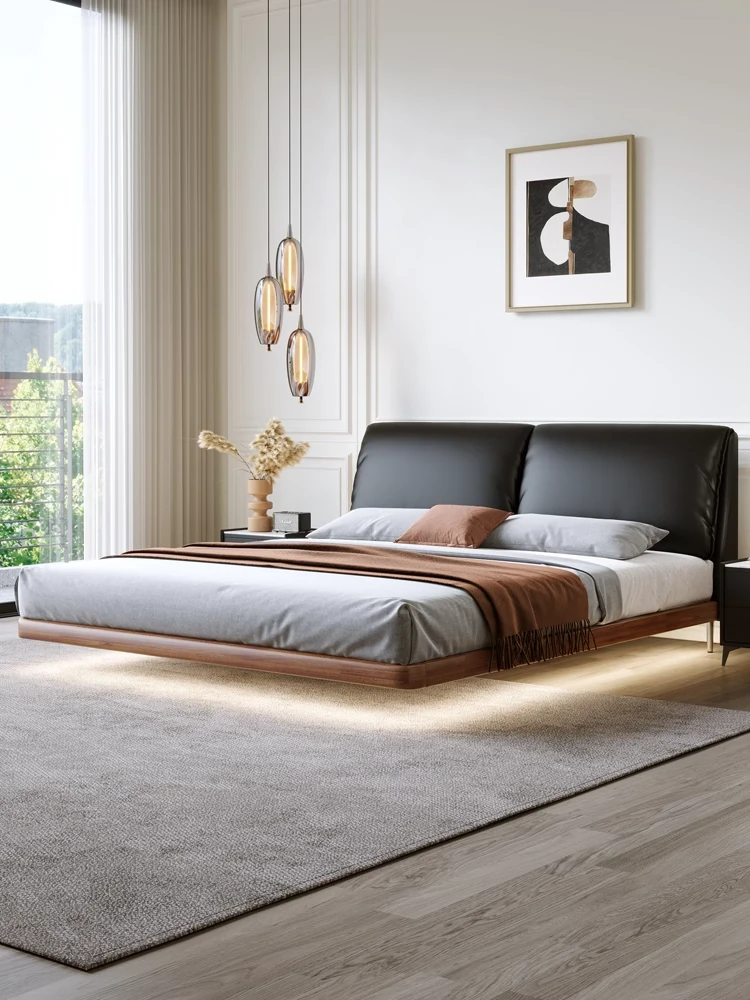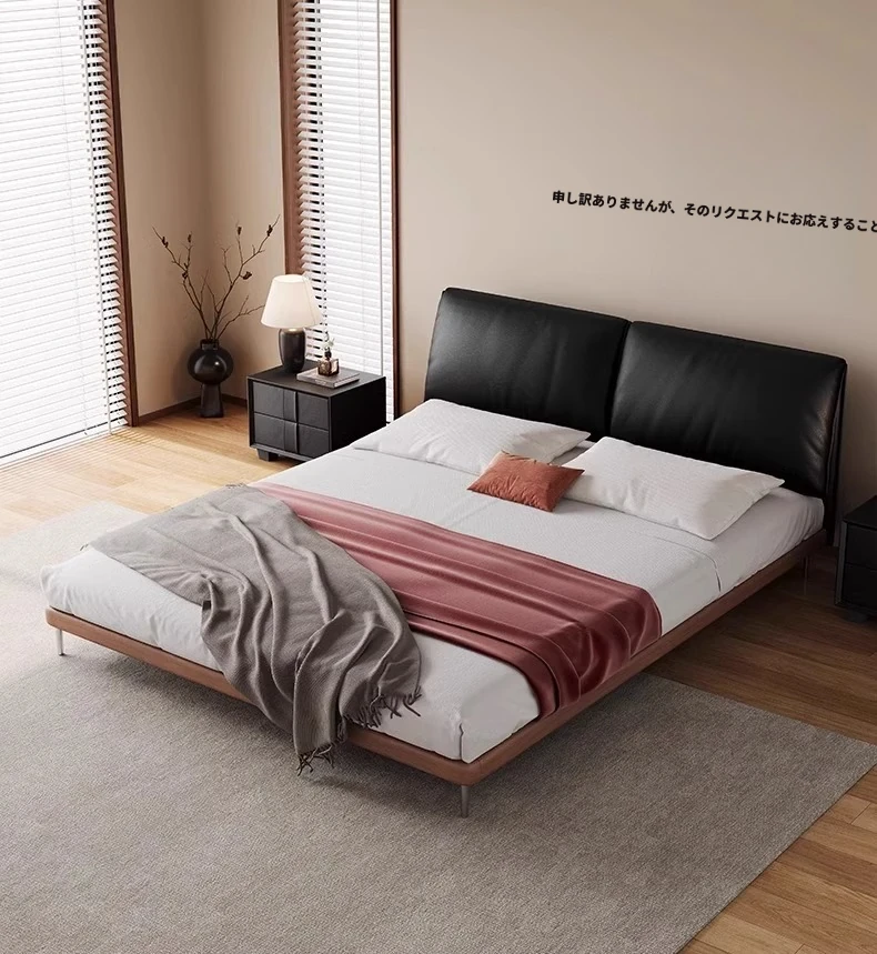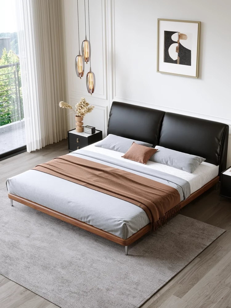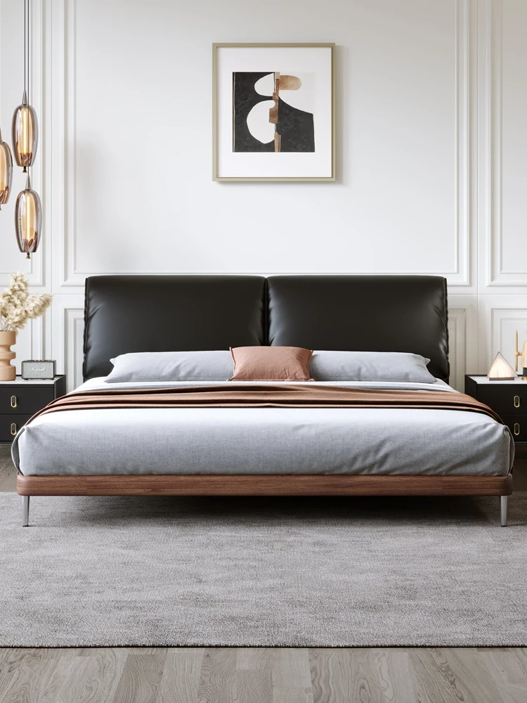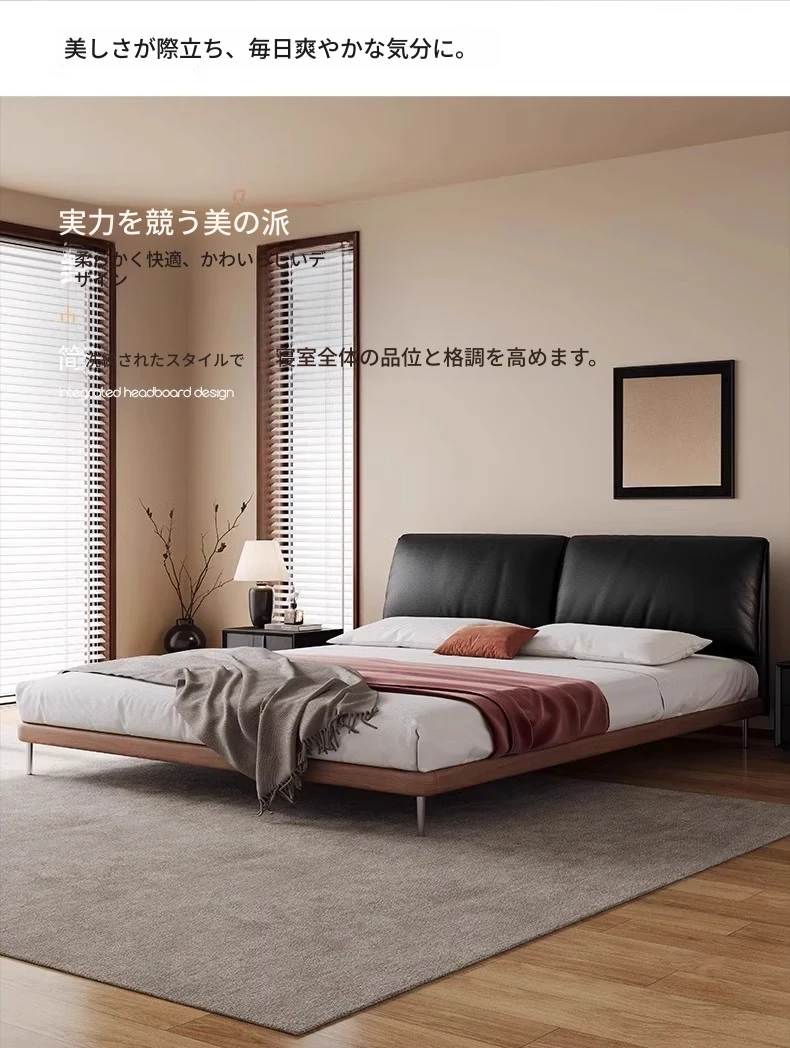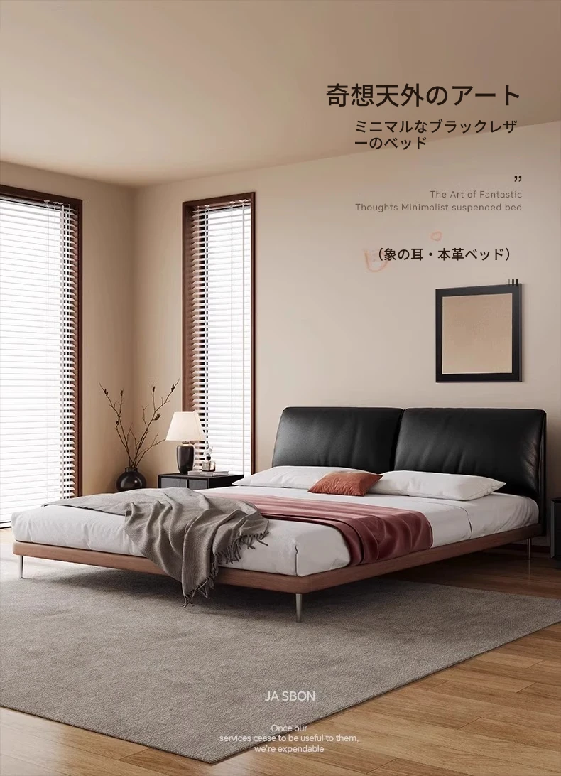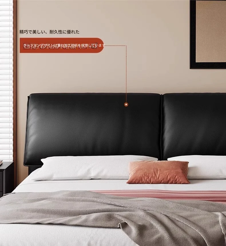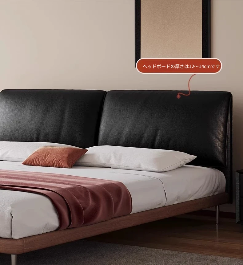 高級感溢れるモダンミニマリスト ブラック レザー ベッド - 主寝室にぴったりなエレガントな象耳デザイン!ホワイトアッシュ無垢材使用で、古風な魅力を持ちつつ現代的な美しさを演出。あなたの寝室を特別な空間に変えます!