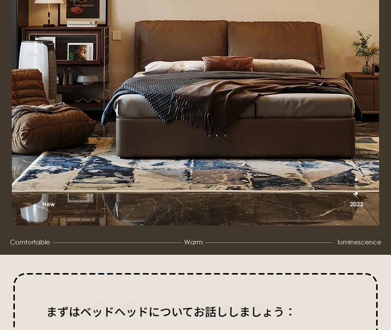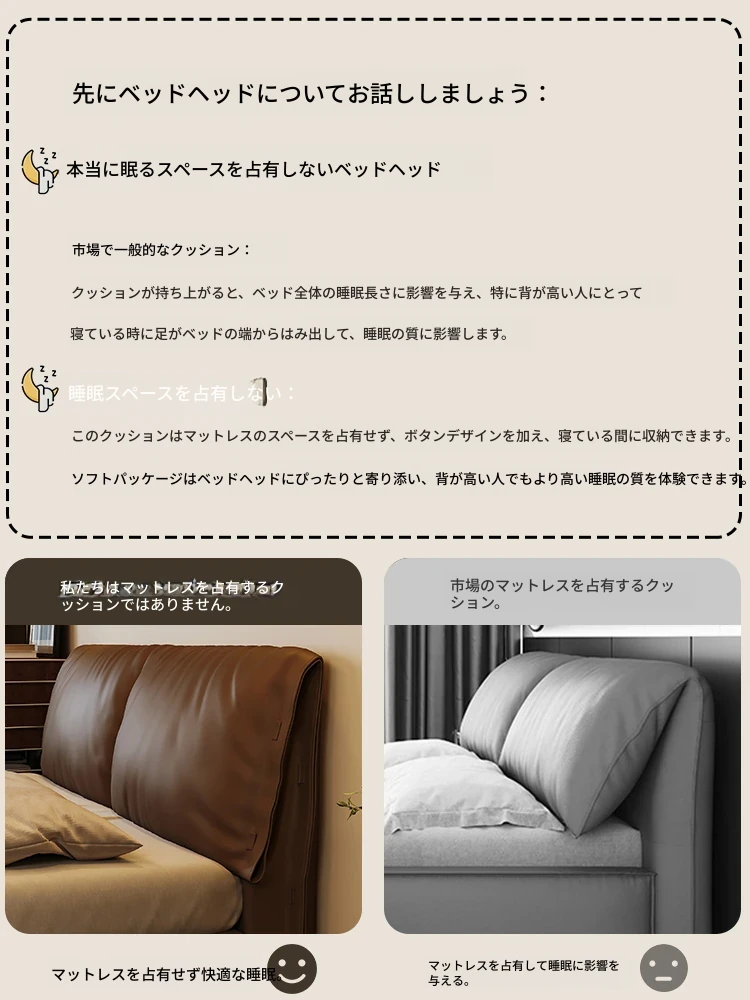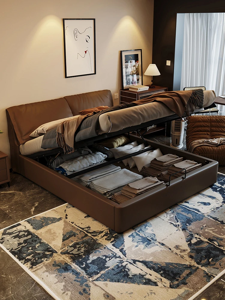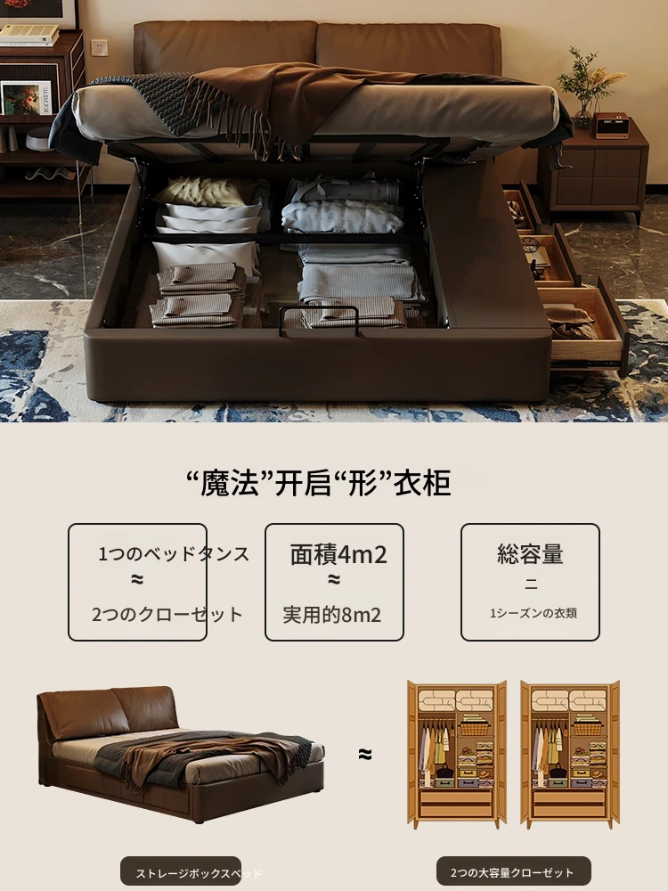 モダンシンプルな象耳デザインの本革ヘッドボード、イタリアンミニマリストスタイルの高床収納ダブルベッド - 主寝室にぴったり!