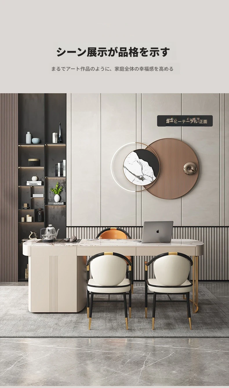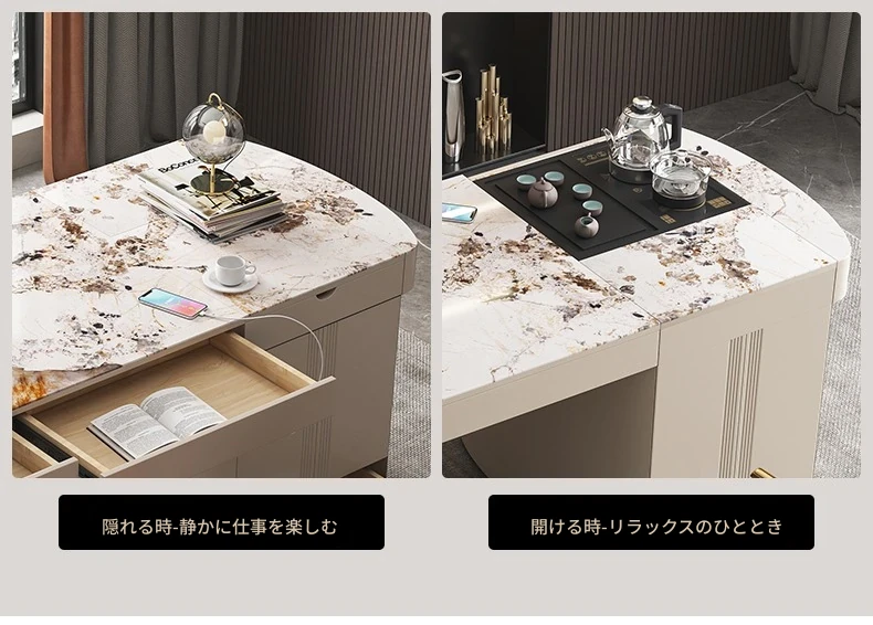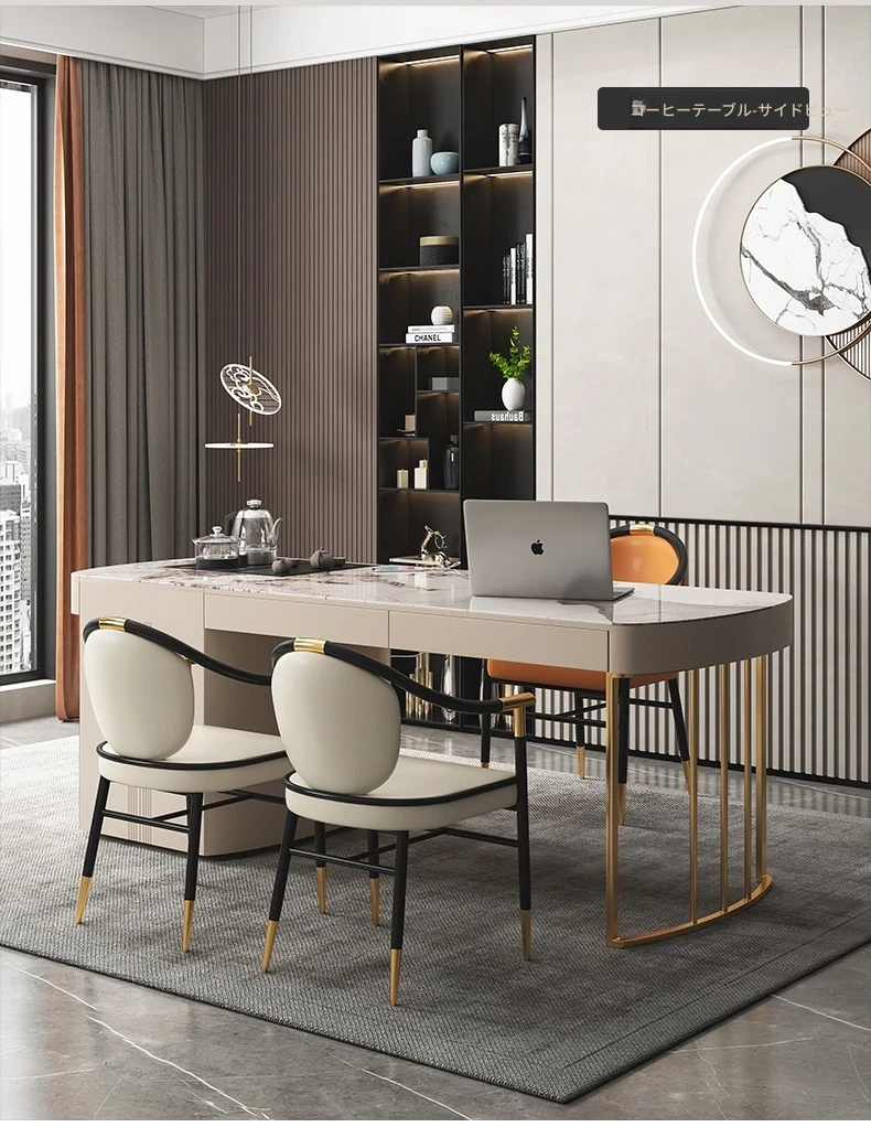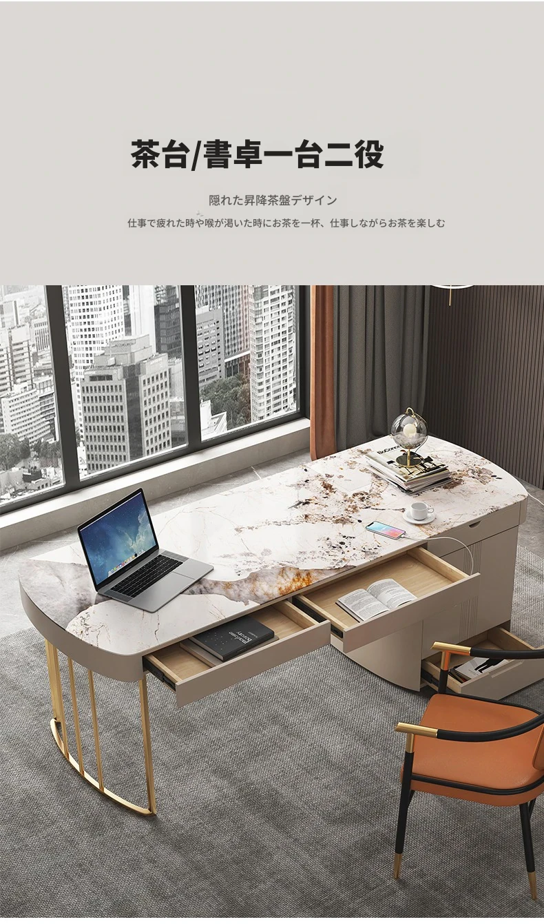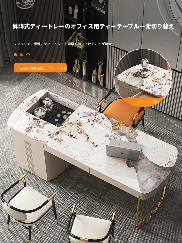モダンシンプルなオフィスデスク&チェアセット:昇降式ティーテーブルにも対応!軽高級感溢れる岩盤仕上げの一体型ティーテーブル×デスクで、洗練されたワークスペースを。