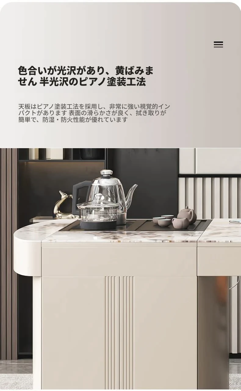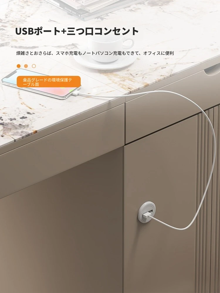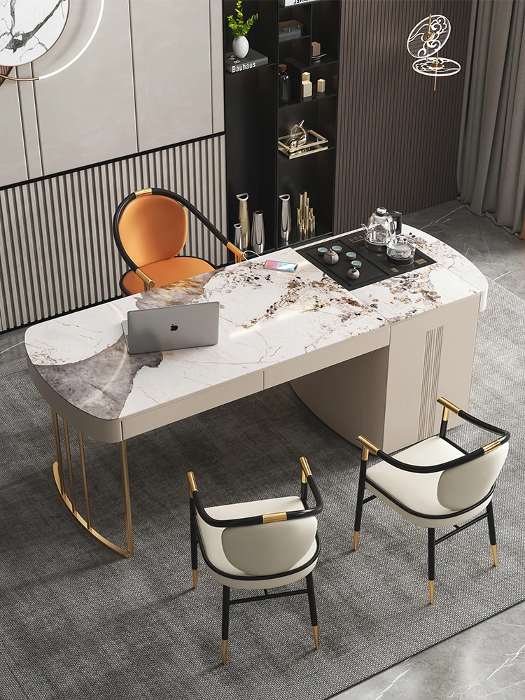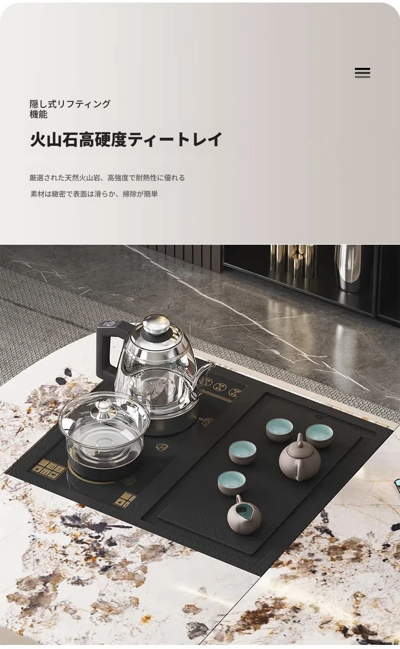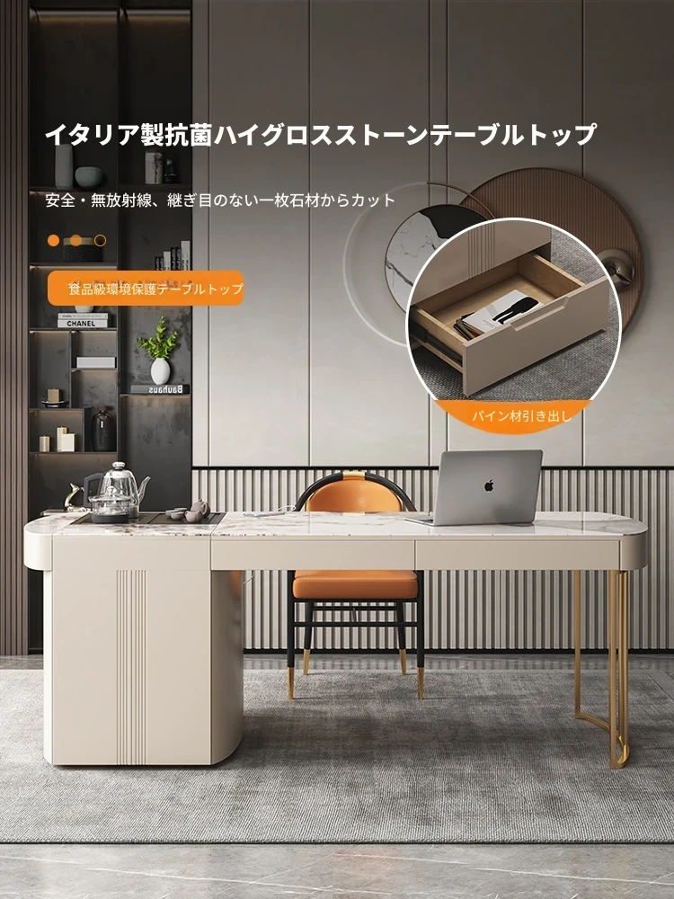 モダンシンプルなオフィスデスク&チェアセット:昇降式ティーテーブルにも対応!軽高級感溢れる岩盤仕上げの一体型ティーテーブル×デスクで、洗練されたワークスペースを。