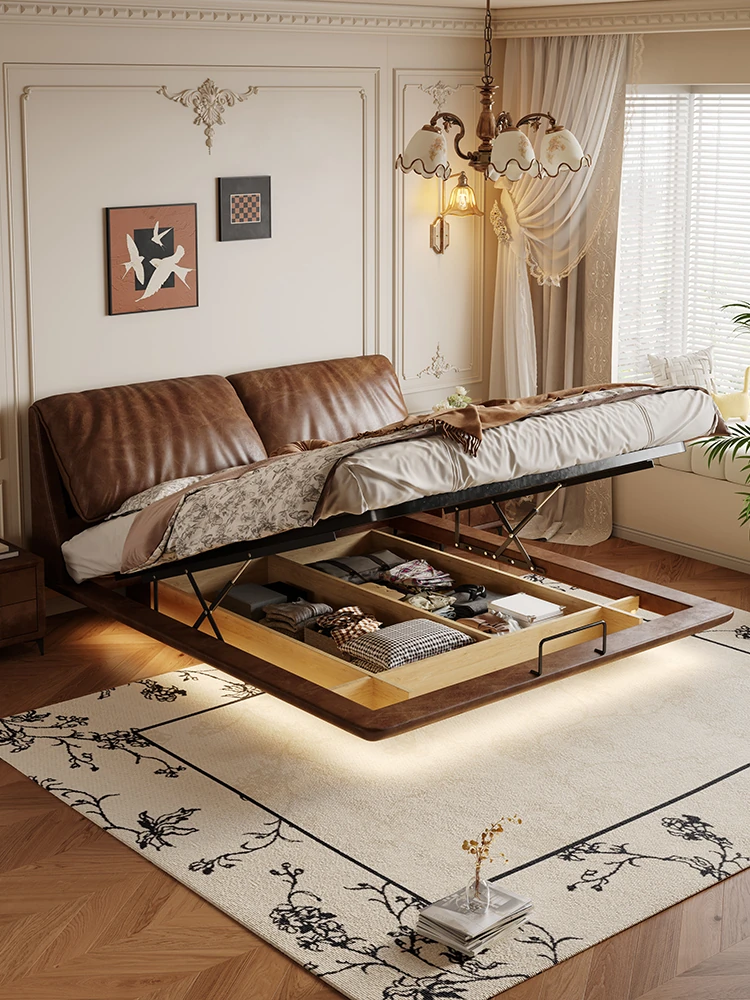 レトロ中古風の本革フローティングベッド、ラグジュアリーなトップグレイン牛革使用の主寝室ダブルベッド、ふわふわソフトパッケージのクラウドフローティングウィンドウベッドで、夢のような寝心地を体験!