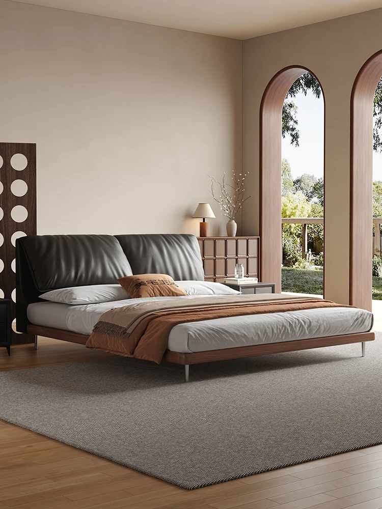 贅沢なイタリアンデザインの本革製スリーピングベッド、シンプルで洗練された無垢材の高級感あふれる黒色ソフトパッケージ、主寝室にぴったりの上品な一品。