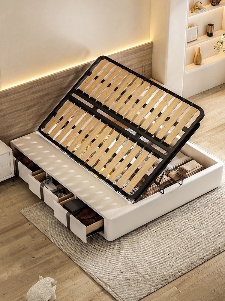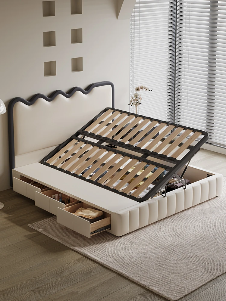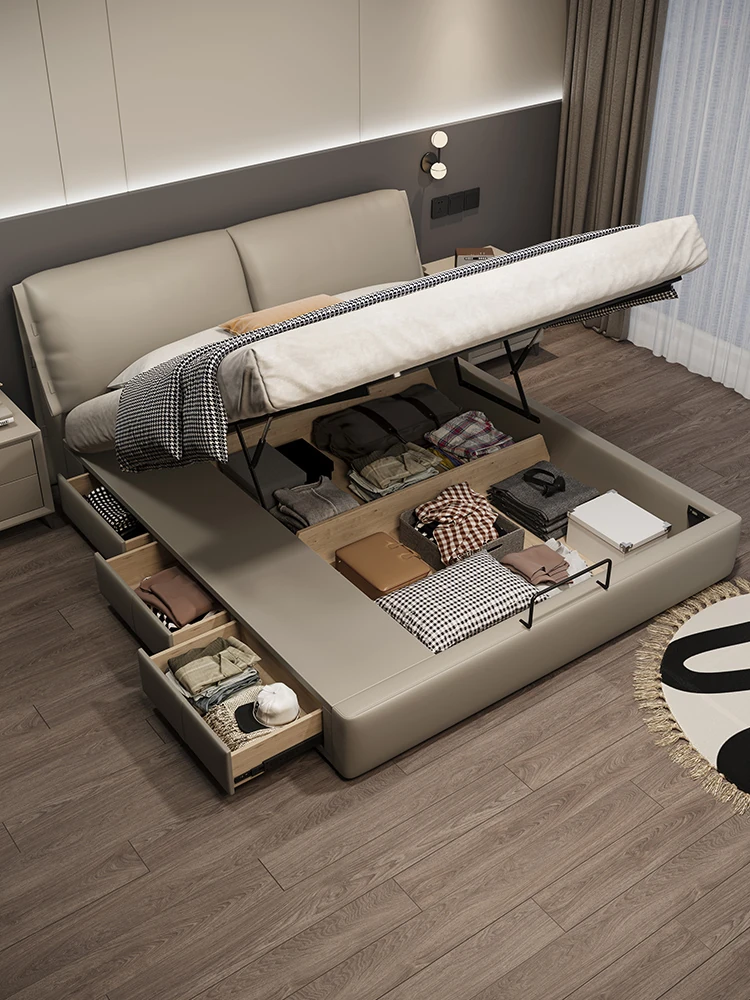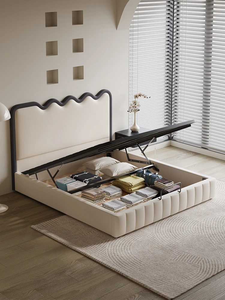 クリーム風の本革ベッド|主寝室にぴったりの高級感漂う収納付きソフトパッキングベッド|モダンでシンプルなデザインの小型住宅向け結婚用ベッド